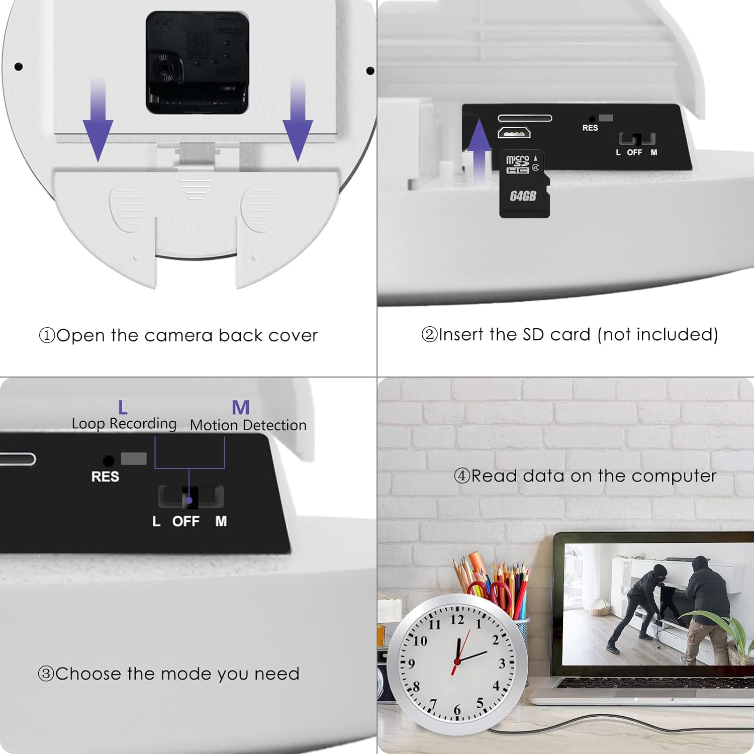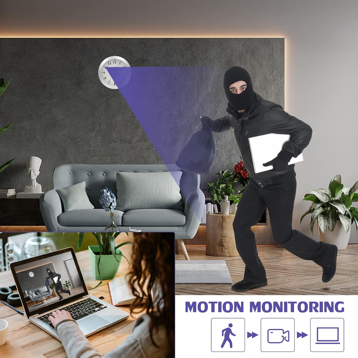 كاميرا ساعة الحائط مزودة بنظام كشف حركة مدمج؛ يمكنك التبديل إلى وضع كشف الحركة حسب احتياجاتك لتوفير مساحة تخزين غير ضرورية ومقاطع فيديو غير مفيدة. كاميرا التجسس لا تحتوي على مصدر ضوء تحت أحمر. إذا كنت ترغب في استخدامها في مكان مظلم، فننصحك باستخدام كاميرا مزودة بإضاءة ليلية.
