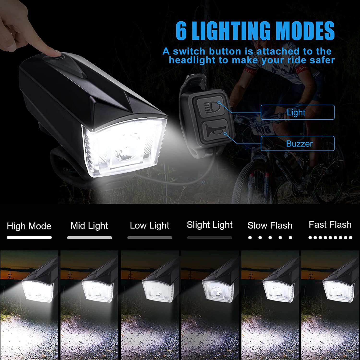 - مجموعة مصابيح دراجة LED، مصابيح دراجة قابلة لإعادة الشحن عبر USB، 6 أوضاع إضاءة دراجة، مصابيح دراجة مقاومة للماء، مصابيح ركوب الدراجات الأمامية والخلفية، مصباح دراجة جبلية، مصباح دراجة طريق، ملحقات دراجة إلكترونية مع جرس إنذار