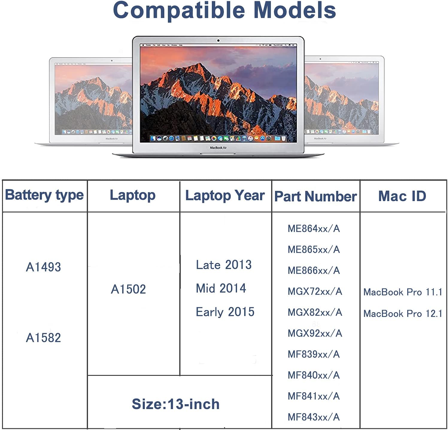 - الحماية الذكية: بطارية مدمجة للكمبيوتر المحمول A1493 A1582 A1502 حماية من درجة الحرارة، حماية من الشحن الزائد، حماية من التفريغ الزائد، حماية من التيار الزائد، حماية من الجهد الزائد، حماية من الدائرة القصيرة ، حماية فعالة للبطارية من التلف وإطالة عمرها!
