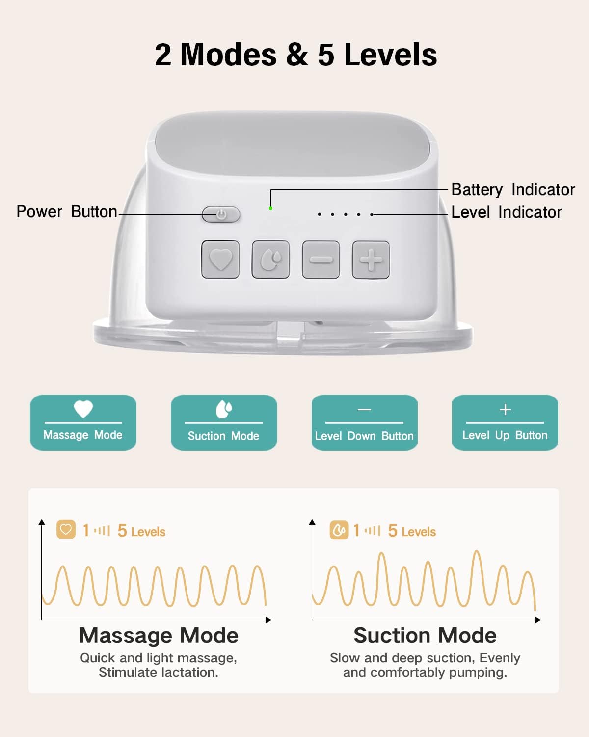 - 【وضعان و5 مستويات】تتميز مضخة الثدي بدون استخدام اليدين بوضعين، ولكل وضع 5 مستويات لضبط الشدة. يحفز وضع التدليك الثديين قبل الشفط لتعزيز تدفق الحليب. أما وضع الشفط، فيحاكي تردد وقوة مص الطفل الفعلي، مع 5 مستويات لضبط الشدة، مما يضمن لكل أم إيجاد إيقاعها الخاص وإنتاج المزيد من الحليب في وقت أقل.