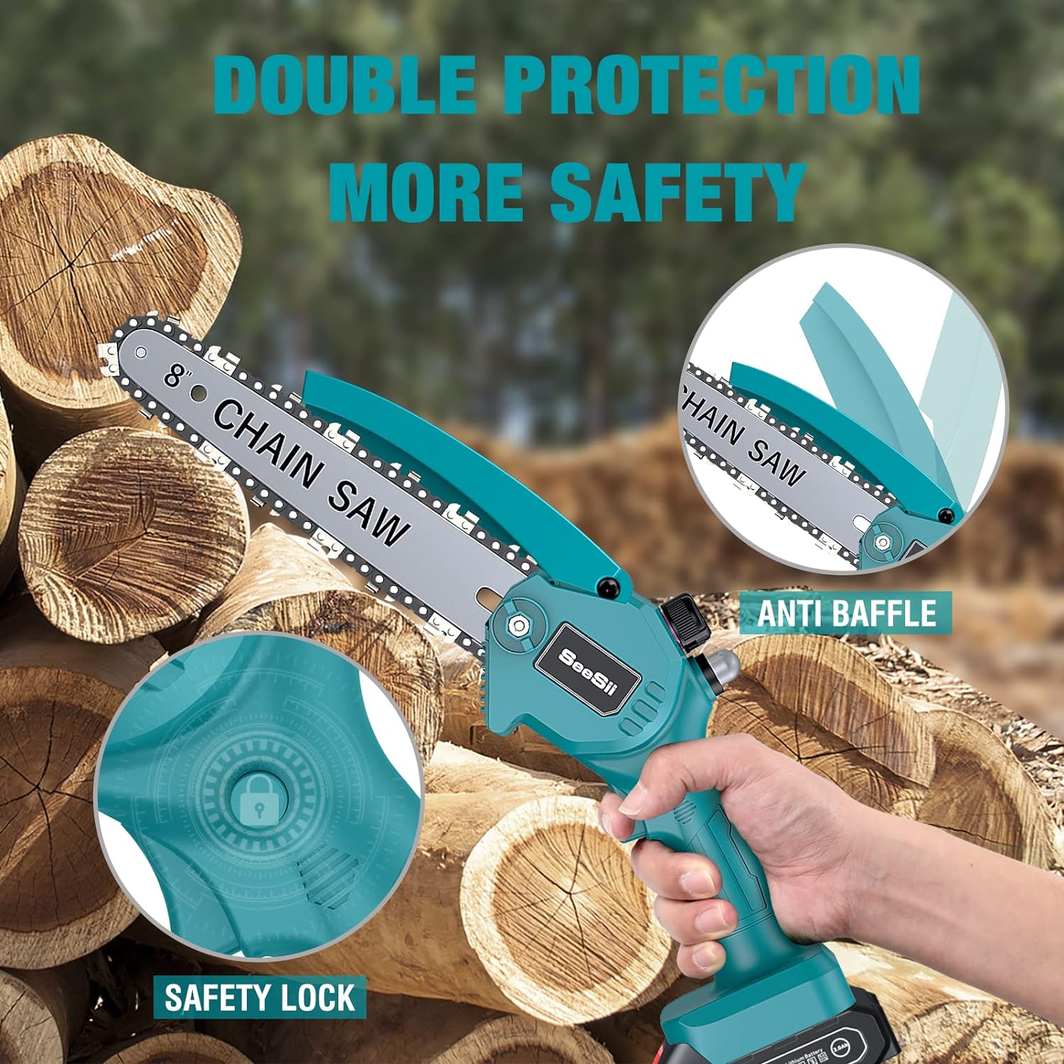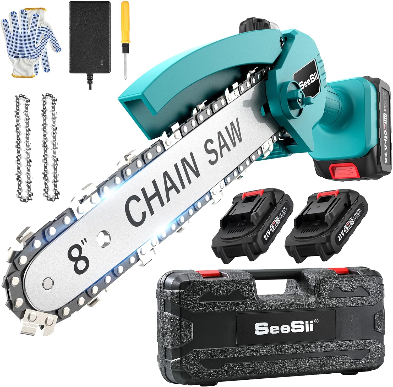 - منشار سلسلة SeeSii مقاس 8 بوصات، منشار سلسلة لاسلكي مزود ببطاريتين 2.0 ونظام زيت تلقائي، ومنشار سلسلة كهربائي بيد واحدة، ومنشار سلسلة تقليم كهربائي لقطع الأخشاب والحدائق وتقليم الفروع