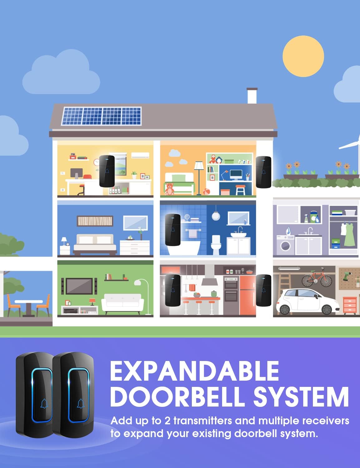- 【نظام جرس الباب القابل للتوسيع】قم بتوسيع نظام جرس الباب الحالي لديك بما يصل إلى 2 جهاز إرسال وأجهزة استقبال غير محدودة، وقم ببناء نظام تنبيه بسيط خاص بك