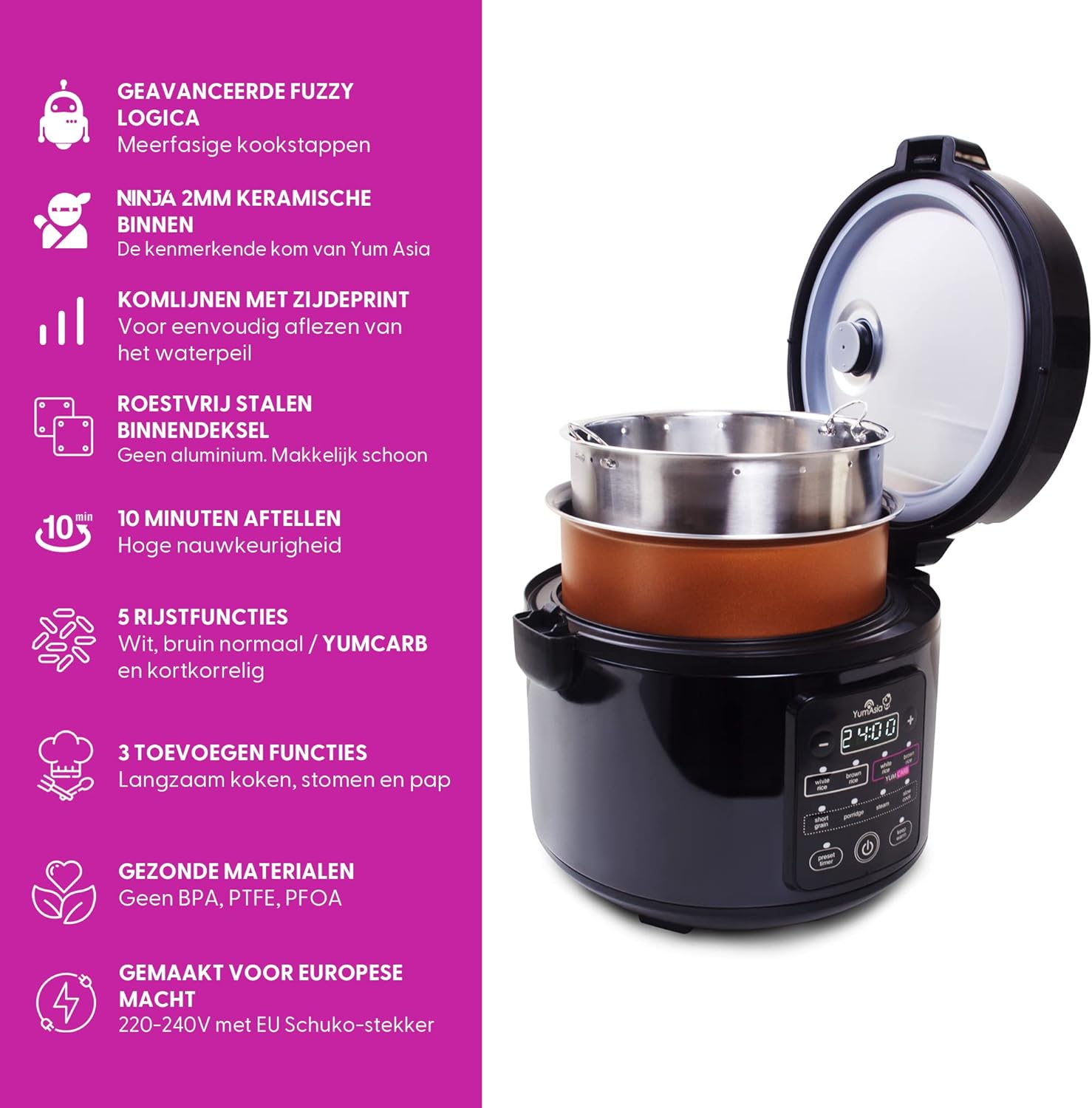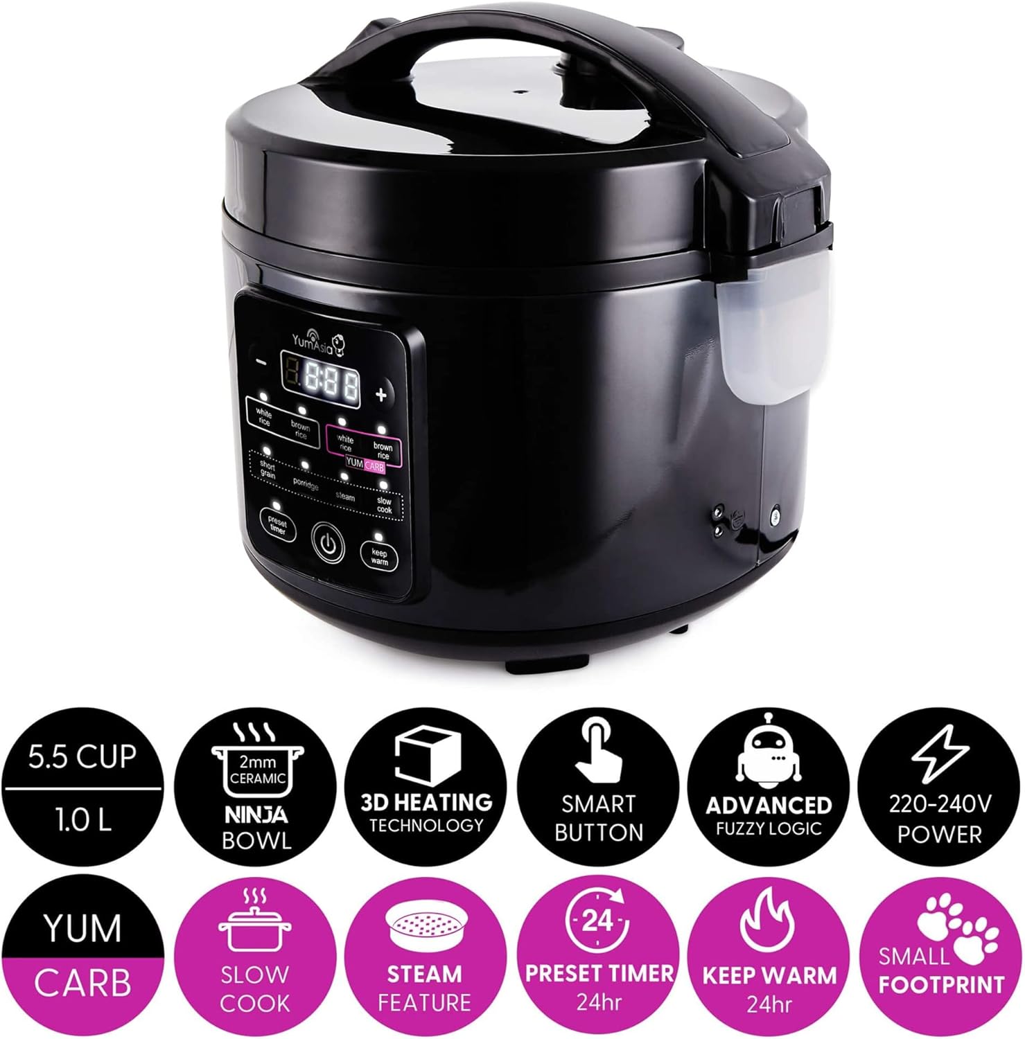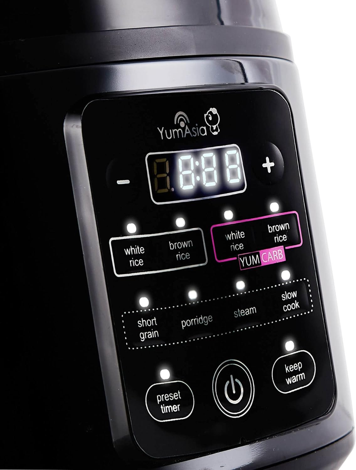 وظيفة طهي الأرز YumCarb فريدة من نوعها في Kumo. هذا الأرز يحتوي على قيمة كربوهيدرات أقل من الأرز المطبوخ التقليدي. بوضع الأرز في سلة YumCarb المصنوعة من الفولاذ المقاوم للصدأ، يُغمر الأرز في الماء في بداية دورة الطهي. عند التنشيط الأول، تُظهر الشاشة 0:20 (أو 0:40 للأرز البني) وستظل كذلك خلال أول 20/40 دقيقة من دورة الطهي. خلال هذا الوقت، يزيد Kumo درجة الحرارة في الوحدة تدريجيًا إلى درجة الحرارة المثالية لطهي الماء الزائد. تمنح هذه العملية وقتًا للنشا للتسرب من الأرز وإطلاق Break (النشا سهل الذوبان). يتدفق الماء النشوي عبر فتحات سلة YumCarb، مما يعني أنه لا يمكن إعادة امتصاص النشويات الممتصة في الماء في الأرز. يكون الأرز جاهزًا للطهي خلال آخر 20 دقيقة من دورة الطهي - يبدأ Kumo بالعد التنازلي. هذه المرحلة الأخيرة من دورة الطهي مهمة للغاية حيث يتم طهي الأرز على البخار في حالة منخفضة الكربوهيدرات، مما يقلل مستوياتها في الأرز بنسبة تصل إلى 25٪