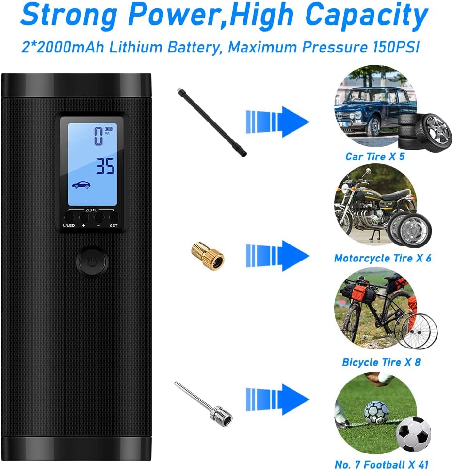 VEEAPE Air Compressor Portable Tire Inflator, 150PSI Electric Air Pump with Pressure Gauge, Heat Dissipation, Rechargeable, Power Bank, LED Light, Tire Pump for Bike Motorcycle Tires Ball(Black)