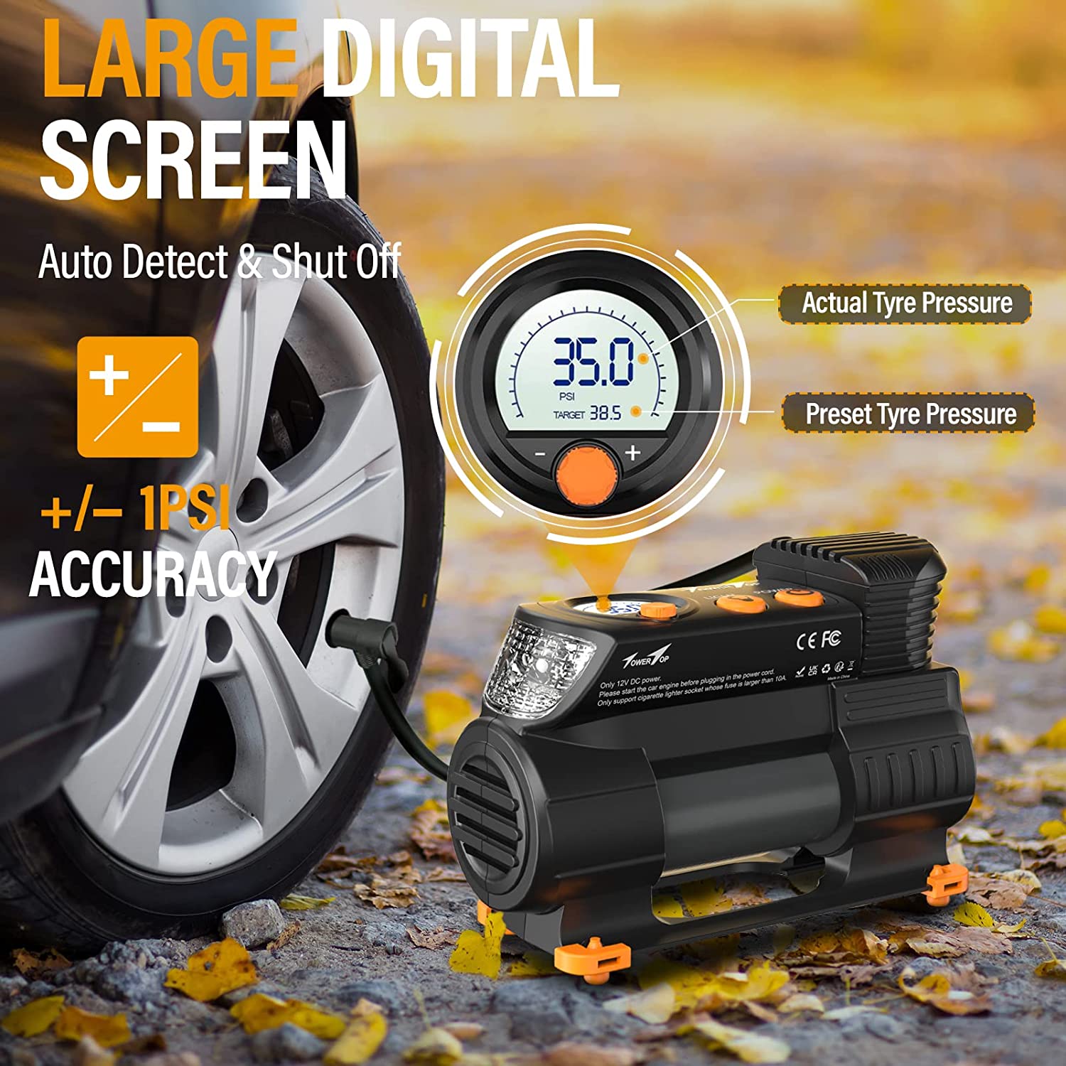 - Accurate Detection & Auto Shutdown: The high-precision sensor controls the error of our tyre pump within ±1PSI.The large LCD backlight screen displays real-time pressure value and preset value, you can accurately detect your tyre pressure at any time; Preset an air pressure value, it can automatically shut down when reached to avoid over-inflation. Enjoy the precision and convenience you deserve!