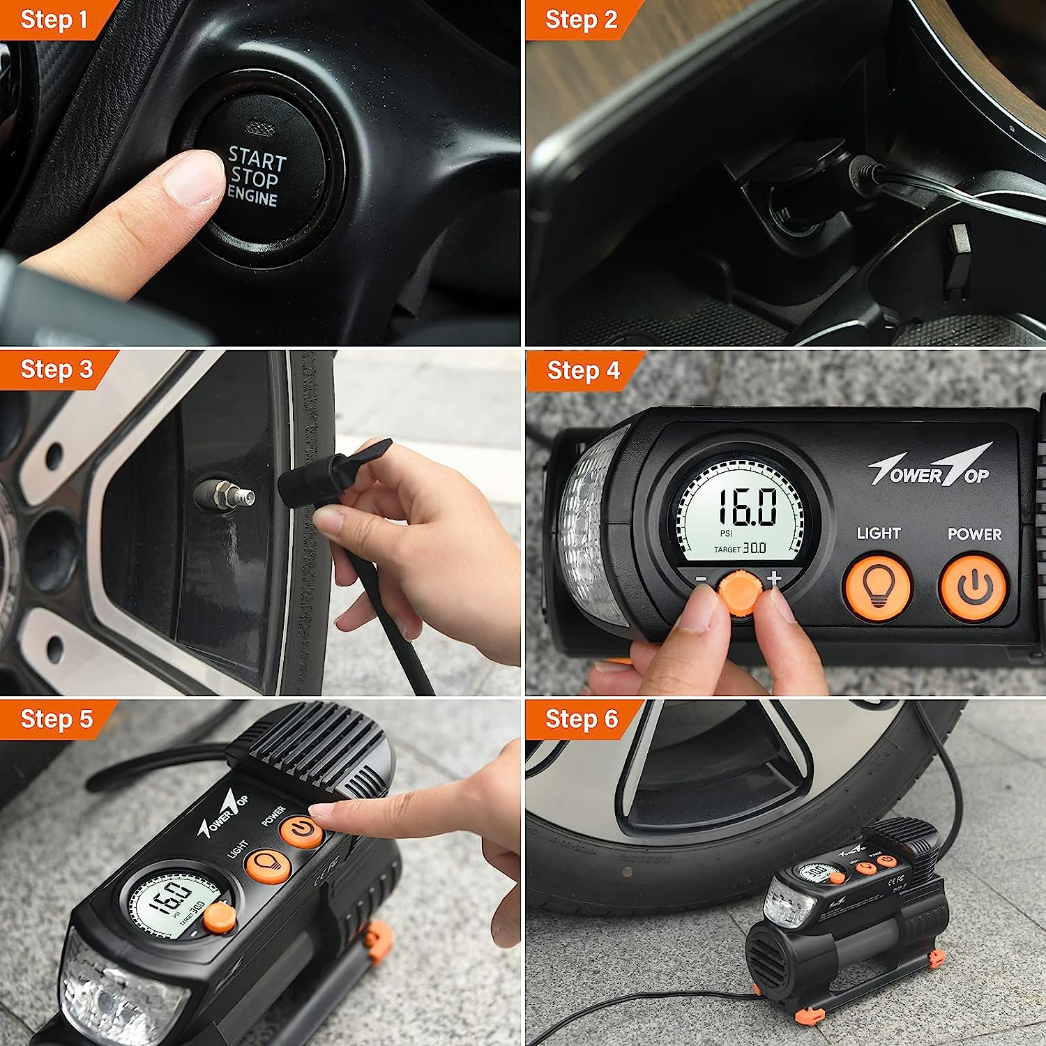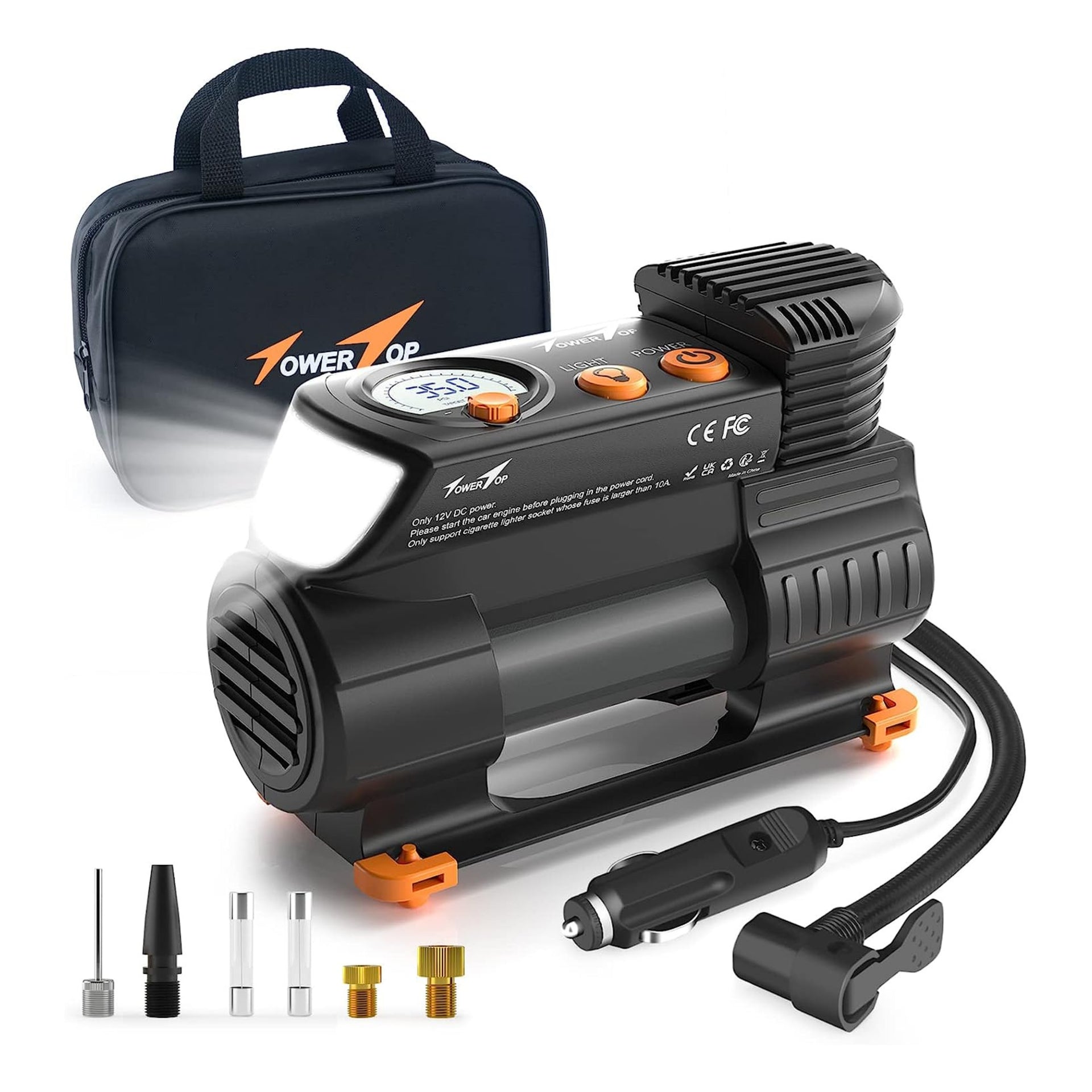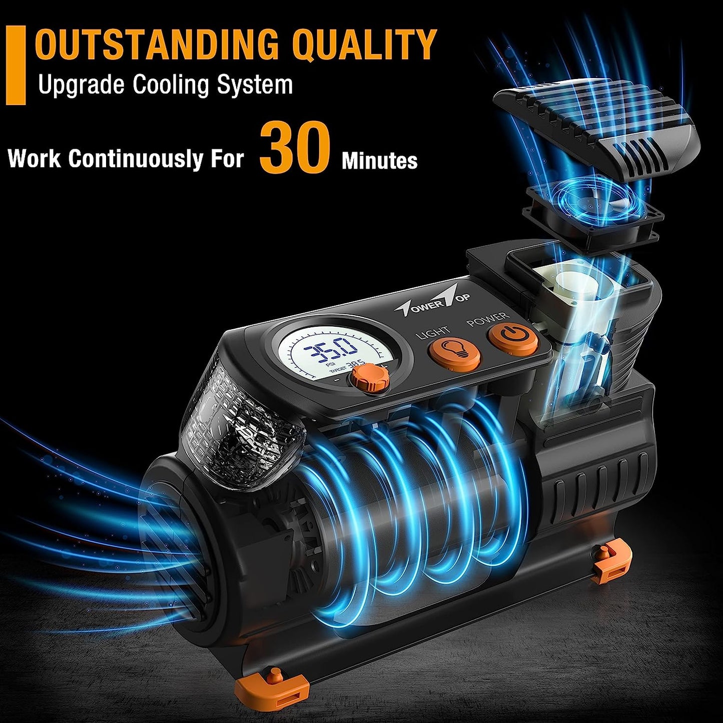 - 2X Faster Inflation & Safety: We adopts a new high-speed pure copper design turbocharger core to make us inflate 2x faster. Only 2.45 minutes to pump up one 185/65 R15 car tyre(0-35PSI). Even under 100 PSI pressure, our working current will not exceed 9A and will not blow the fuse. Get the speed and safety you need for your next journey with TowerTop!