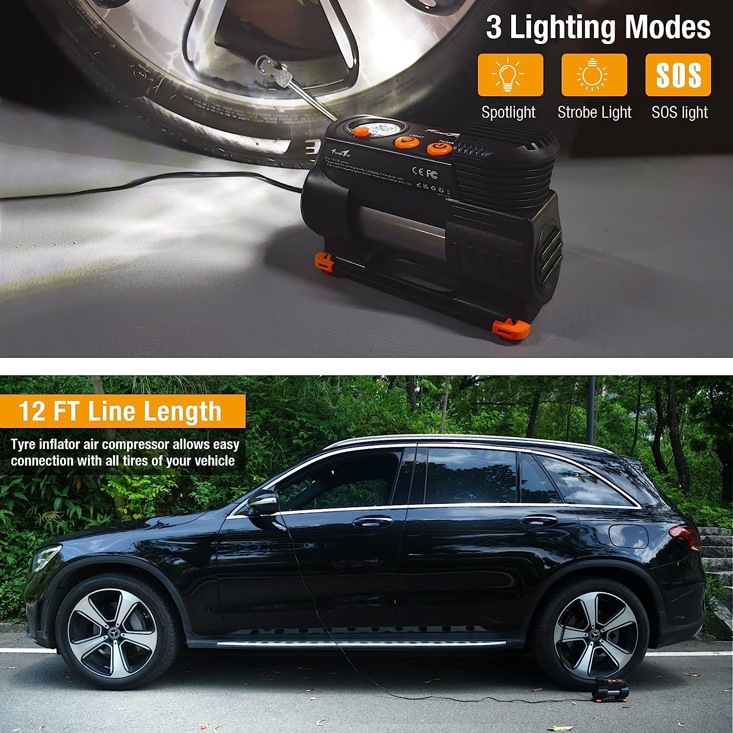 - Great Design & 12FT Cord & LED Light: This tyre compressor boasts a 10.1ft power cord and 1.9ft air hose, enough to reach each tyre. The super bright LED light has 3 modes. Great for nighttime use. With optimized shock absorbers, our digital tyre inflator is more stable and secure, and produces less noise. Comes with a waterproof handbag for easy storage in your trunk, so you'll never have to worry about low tyre pressure.