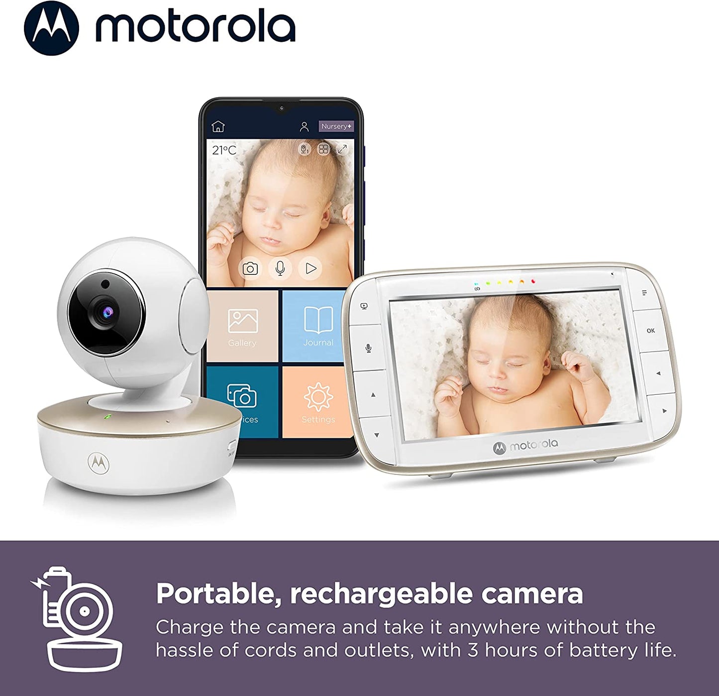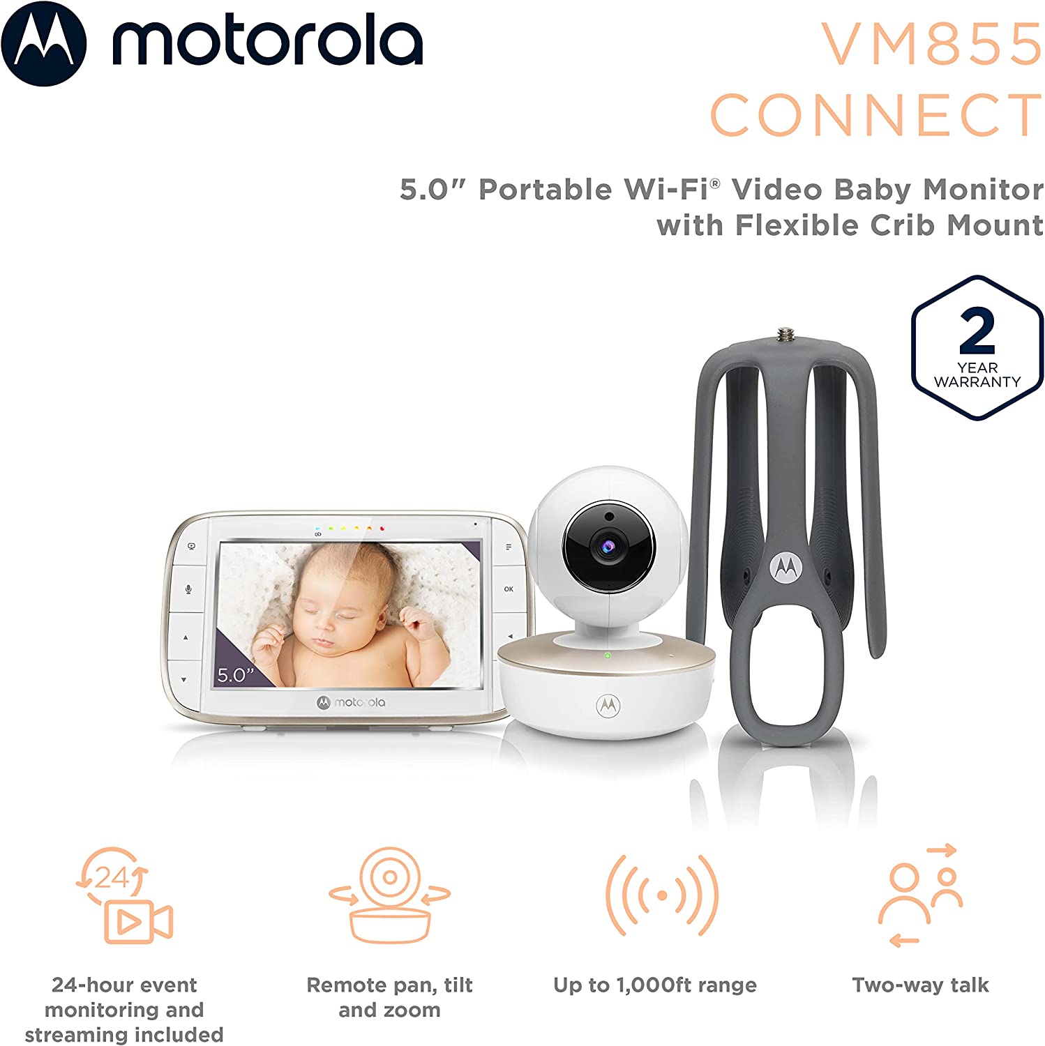 - Motorola Baby Monitor VM855-5" WiFi Video Baby Monitor with Camera and Crib Mount, HD 720p - Connects to Smart Phone App, 1000ft Range, Two-Way Audio, Remote Pan-Tilt, Digital Zoom, Room Temp, Music