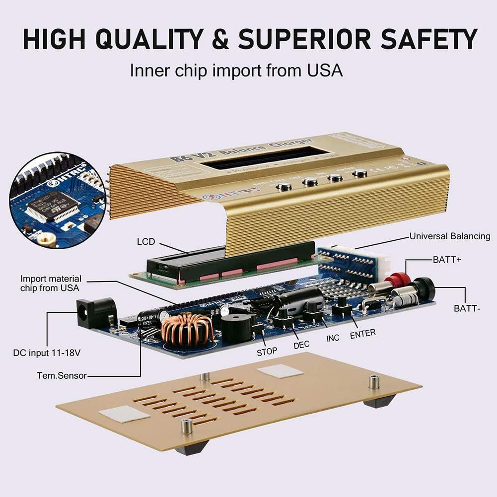 - 【VARIETY BATTERY CHARGING】 Our B6V2 RC BATTERY CHARGER is upgrade version of B6 charger, it can support a variety of battery types: LiPo, LiFe, Li-ion, LiHV, NiMH, NiCD, Pb batteries, smart batteries. When the battery is full charged, the battery charger will automatically stop charging. The chargers's shell is made of fire-proof material.