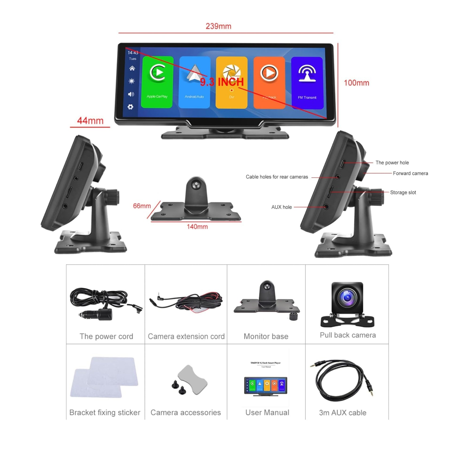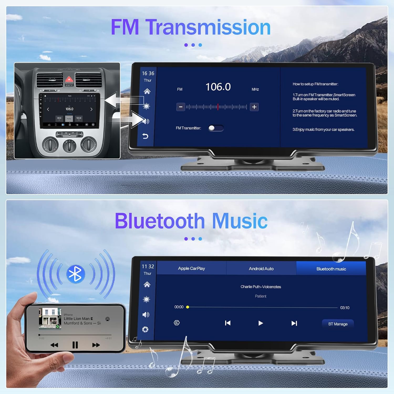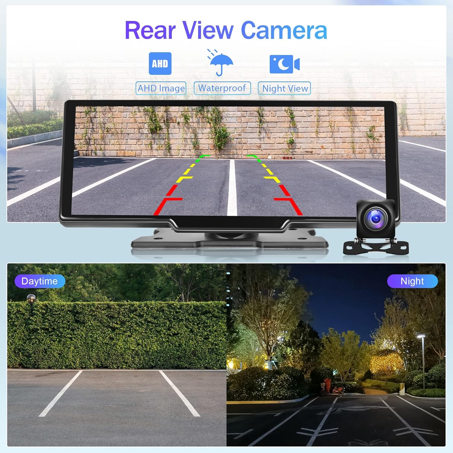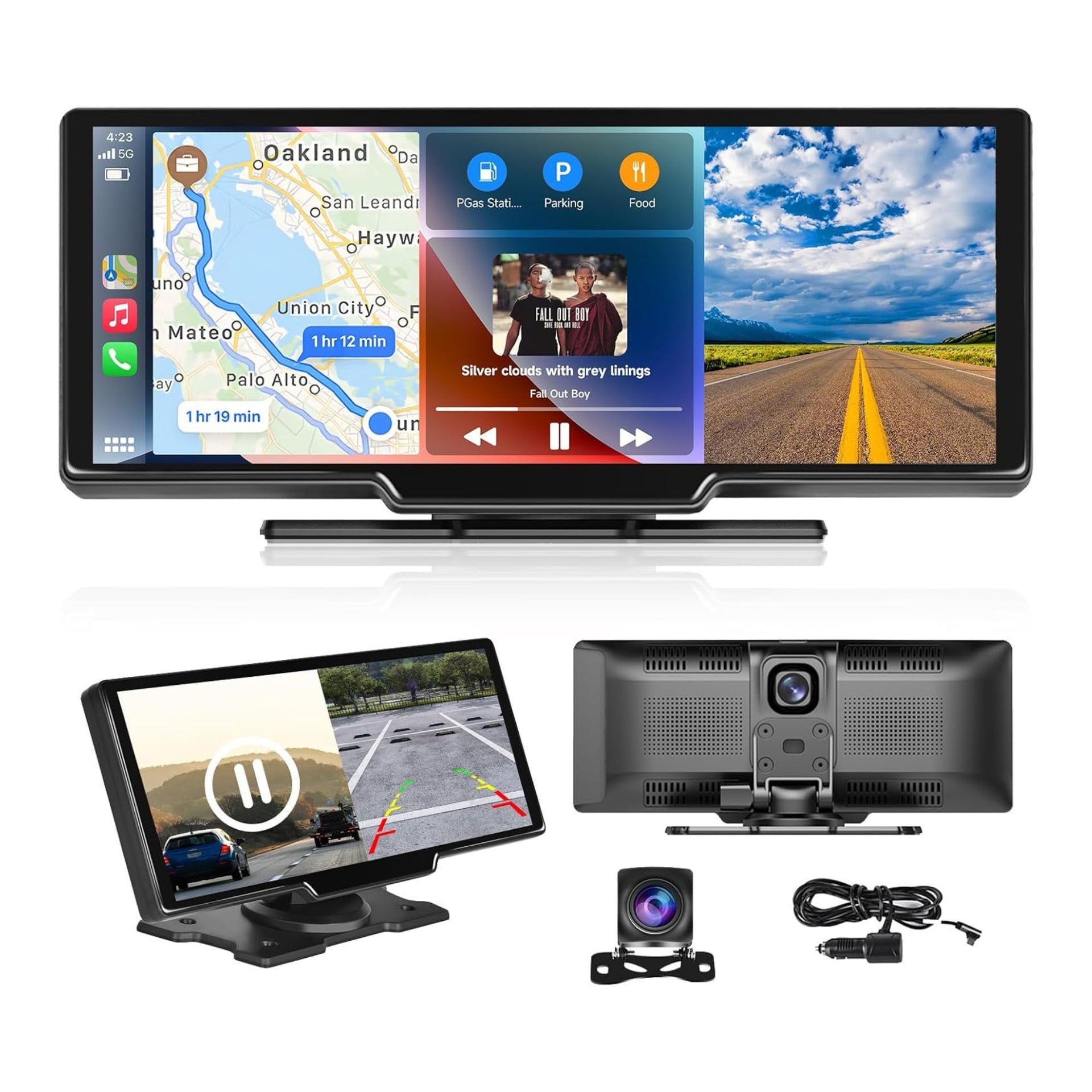 Dual Dash Cam Full HD 1080p Wireless Car Stereo with Apple CarPlay, Dash Cam, and 1080P Backup Camera. Portable Touchscreen GPS Navigation for Car, Bluetooth, AirPlay, AUX/FM, Google, Siri. Car Stereo Receiver