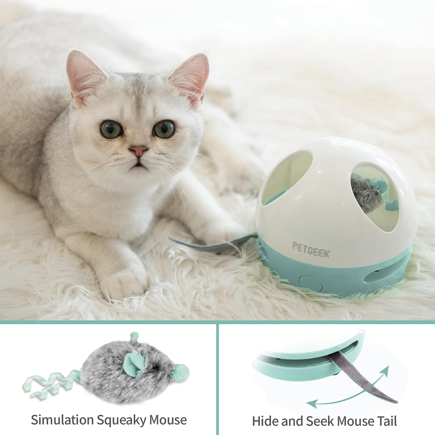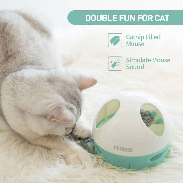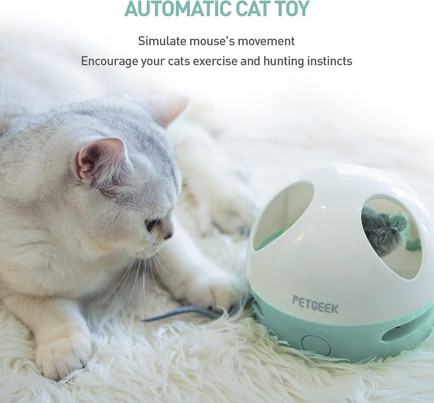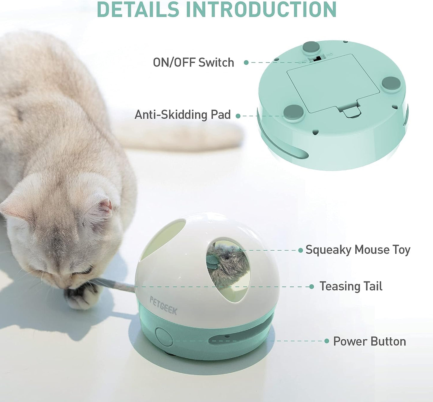 About PETGEEKLove pet, live smart. PETGEEK is a high tech and caring pet brand. With this vision, we gathered a group of experts who have geek spirit and also care a lot about their pets. And we set out a mission dedicated to offering a smarter and happier lifestyle for our pets, to exploring the new possibilities for pets. PETGEEK production process pursues the world standards and have passed ISO9001 Quality System Certification.PETGEEK Electronic Hiding Mouse Cat Toy- C97015CSize: 5.2 inches in length, 4.5 inches in heightMaterial: TPR/PlushWeight: 200g (0.44 lb)Battery Type: 2 AA batteries (not included)Working Voltage (V): 3Wattage(W): 0.75-1.2Notes:The device is specially designed for pets. This is not a child’s toy. Please keep out of reach of children except under adult supervision. Please use in a clean and safe environment and keep it away from water, fire, high temperature and dirty place.Not washable. Please wipe clean with a moist cloth if it is stained.Check the device regularly, and replace the toy if damaged.Do not mix old and new batteries or batteries of different brands. Do not mix alkaline, standard, or rechargeable batteries. Only use batteries of same or equivalent type as recommended. Do not use rechargeable batteries.Please remove the batteries if you won’t use the device for some time.