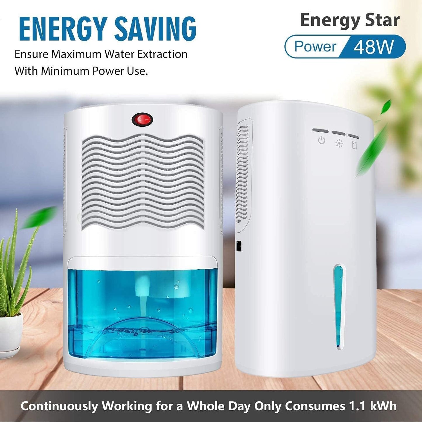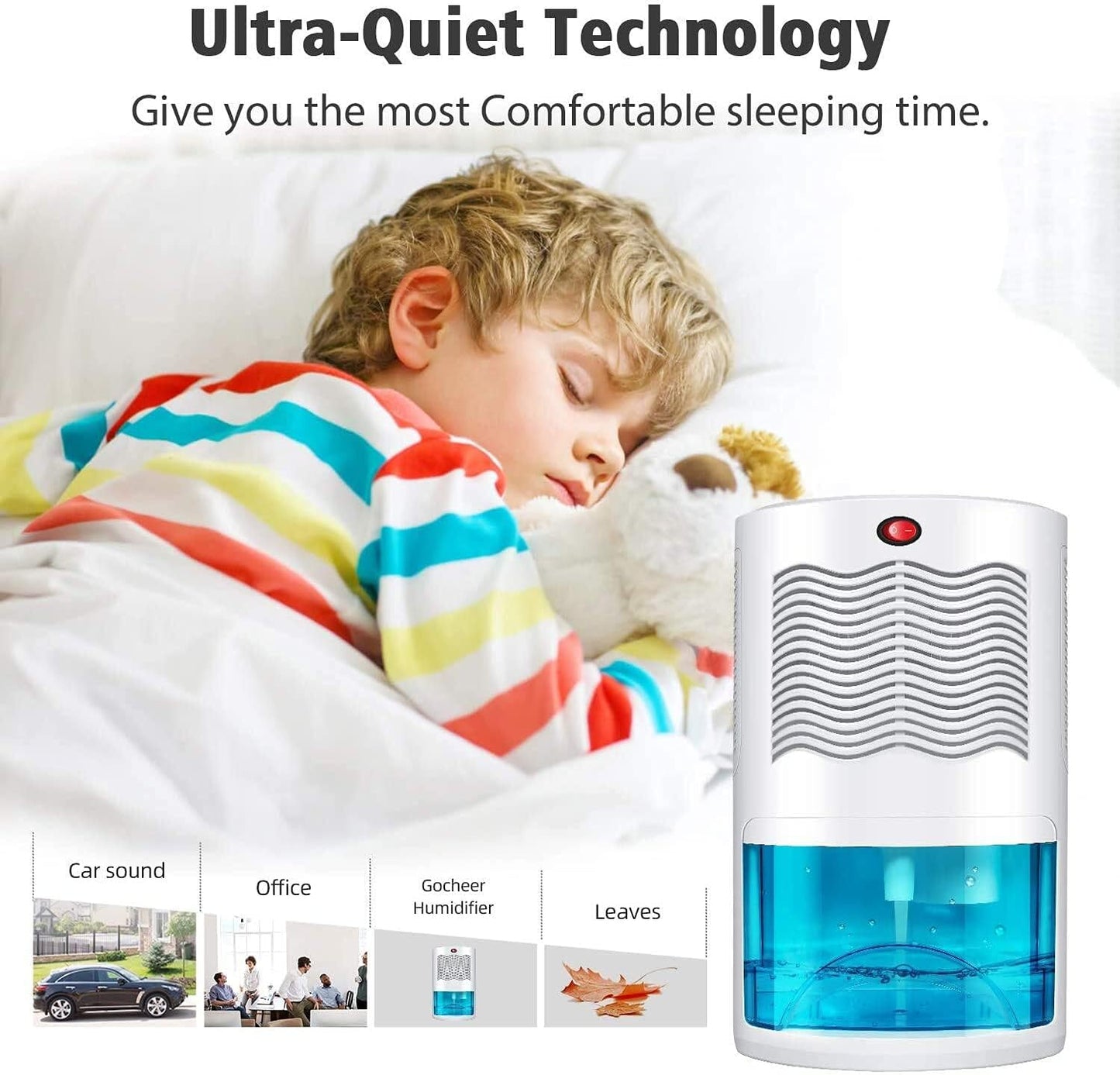 - Ultra-Quiet Safe Dehumidifier: Gocheer small dehumidifier for home can efficiently take excess water out of the air, produced to help provide you with a comfortable environment, and the working noise is below 45dB, you will never feel disturbed when reading or sleeping. Besides, Our home dehumidifier provides full energy efficiency through its UL-certified adapter that helps to prevent overheating for use without worries.