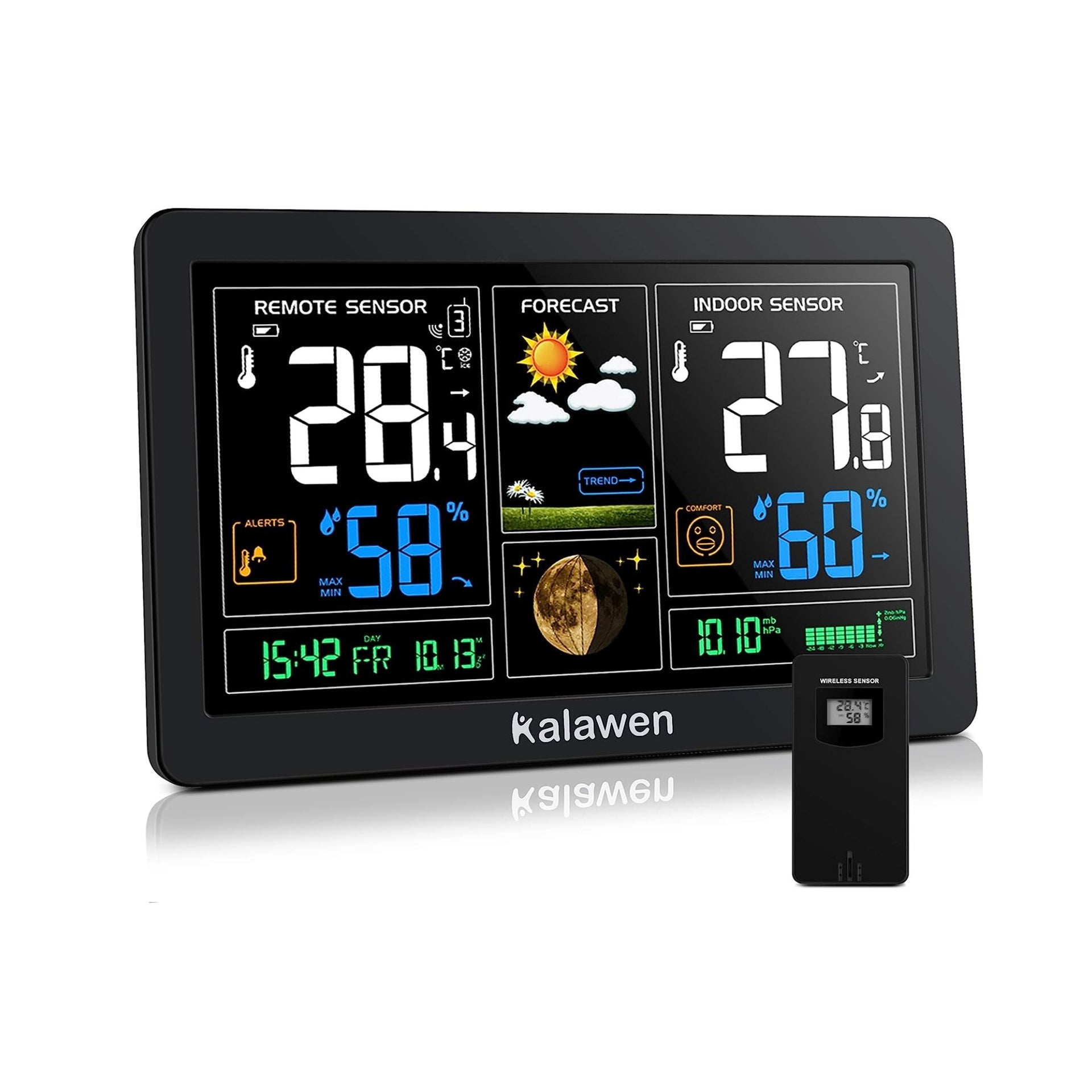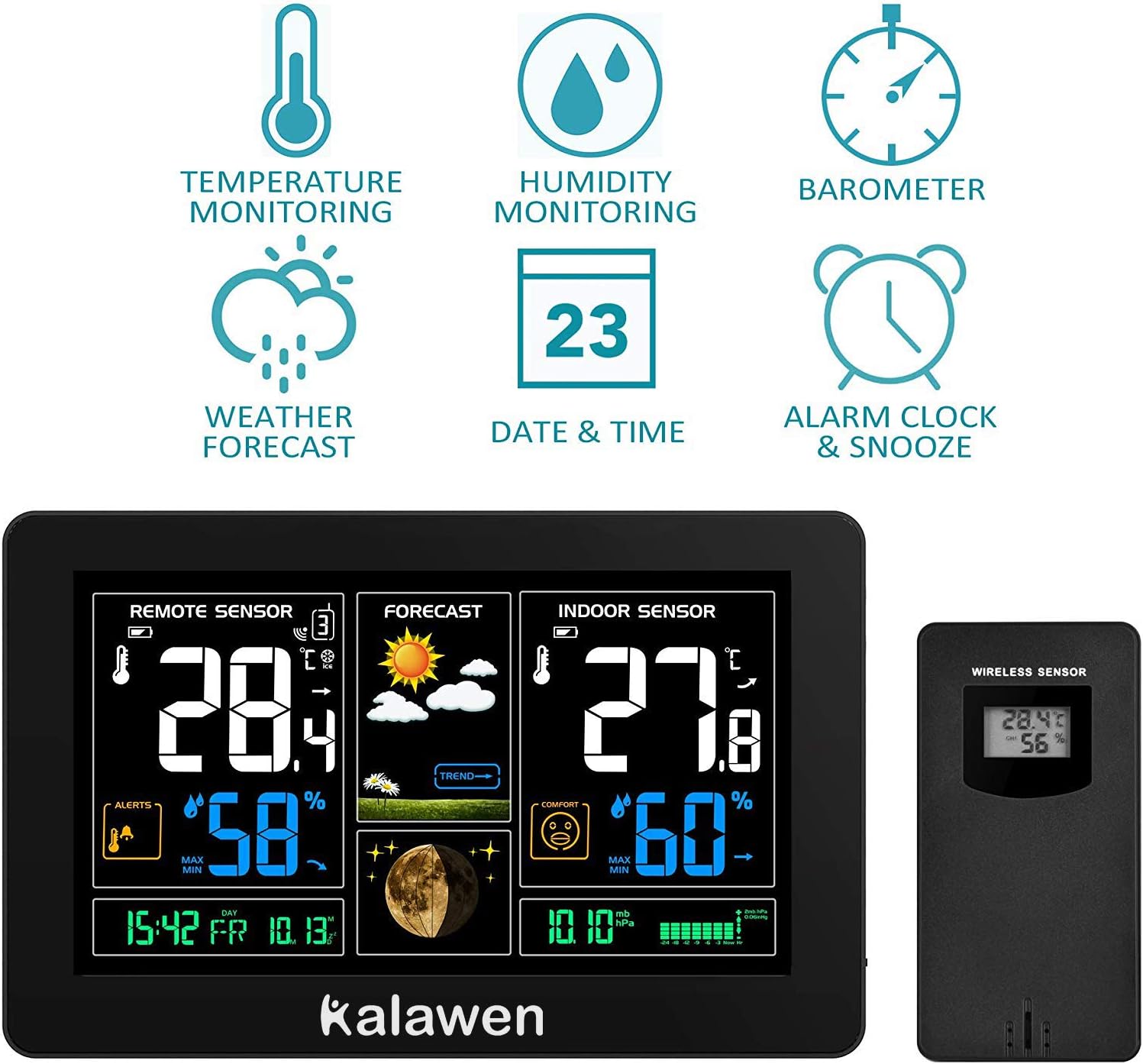 - Kalawen Wireless Weather Station with Outdoor Sensor, Digital Colour Display, Wireless Weather Station, DCF Radio Clock, Multifunctional Weather Station, Thermometer, Hygrometer, Indoor and Outdoor LCD Display with Weather Forecast