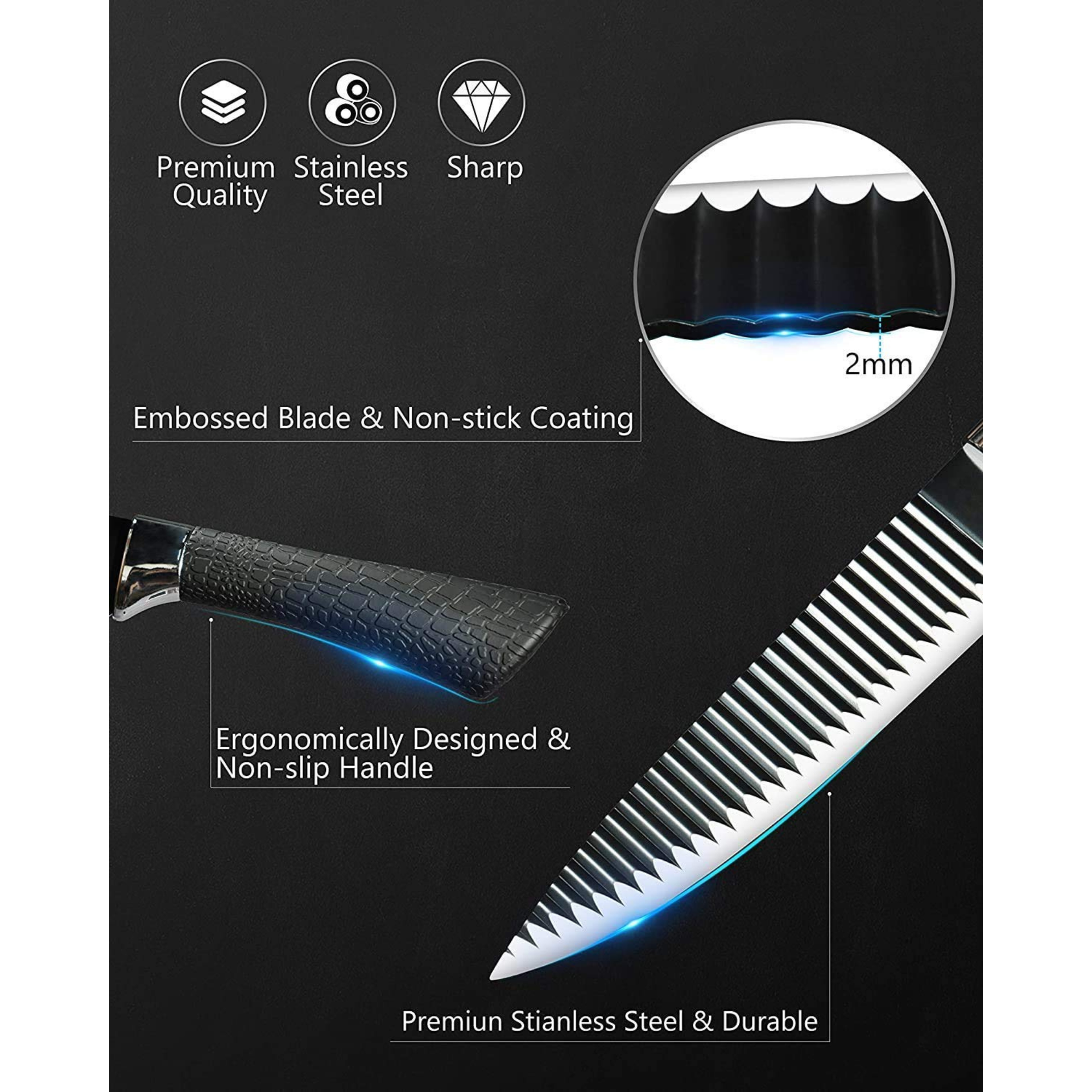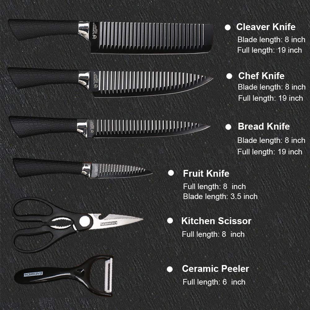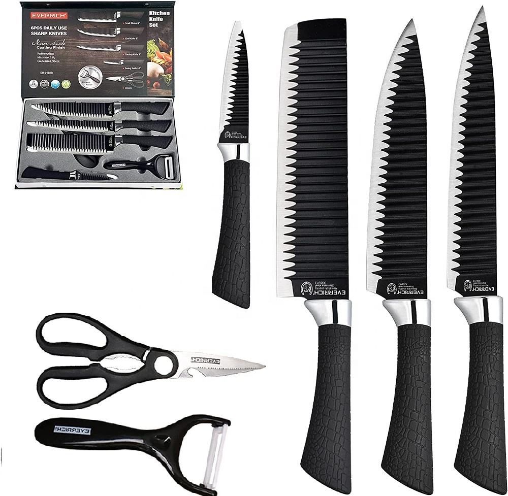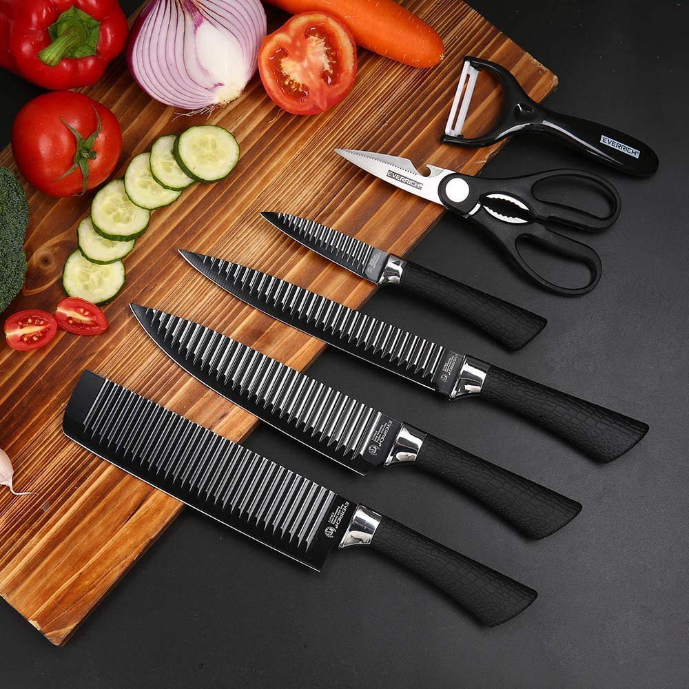 EVERIERH 6 Pieces Black Knife Set, Stainless Steel and Non-Stick Blades, Including Peeler and Scissor, Kitchen Cutlery Knives Set, Cooking Utensil Sets, Daily Use with Gift Box