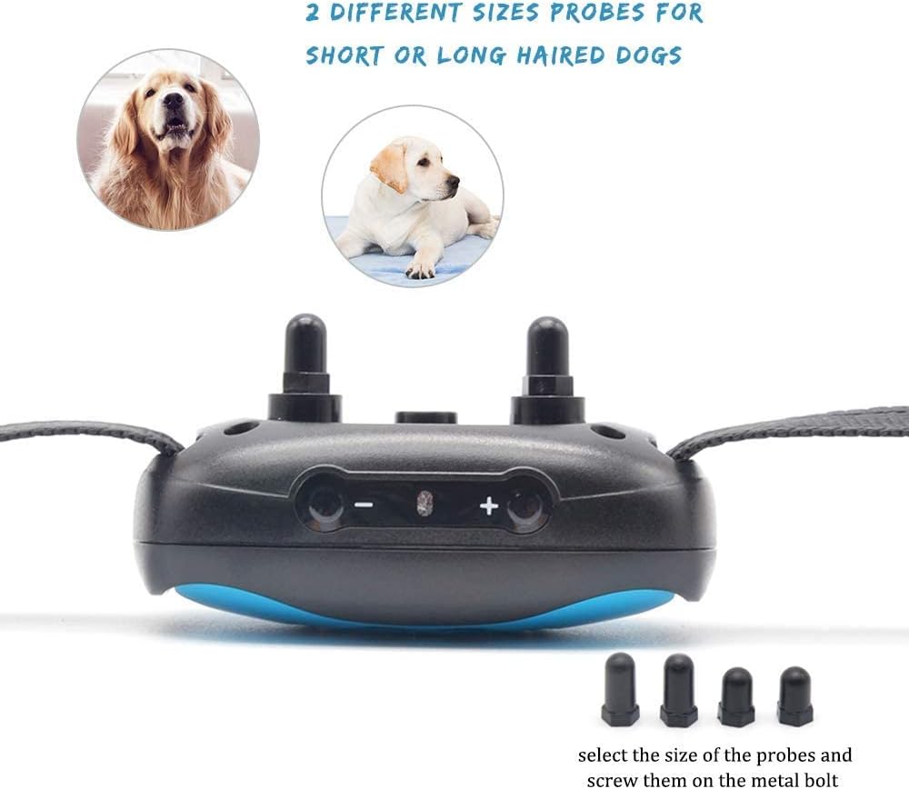 - 🐶GIFT PACKAGE BARK COLLAR: In addition to stop dog barking collar we provide 2 batteries, 1 safety dog light, 2 types of plastic prongs and 2 color covers. 2 pairs of probes for both long hair and short hair dogs, even allergic dogs.