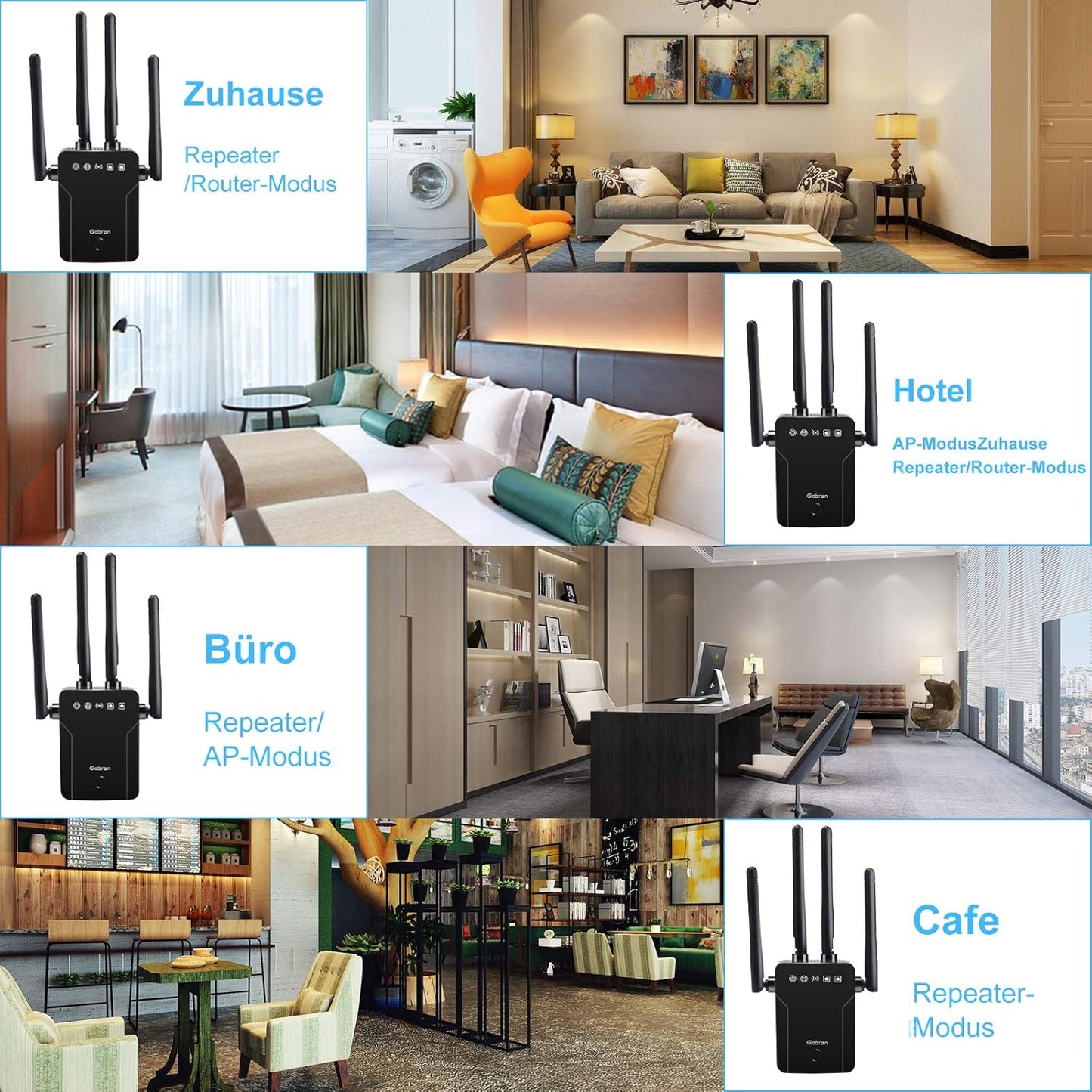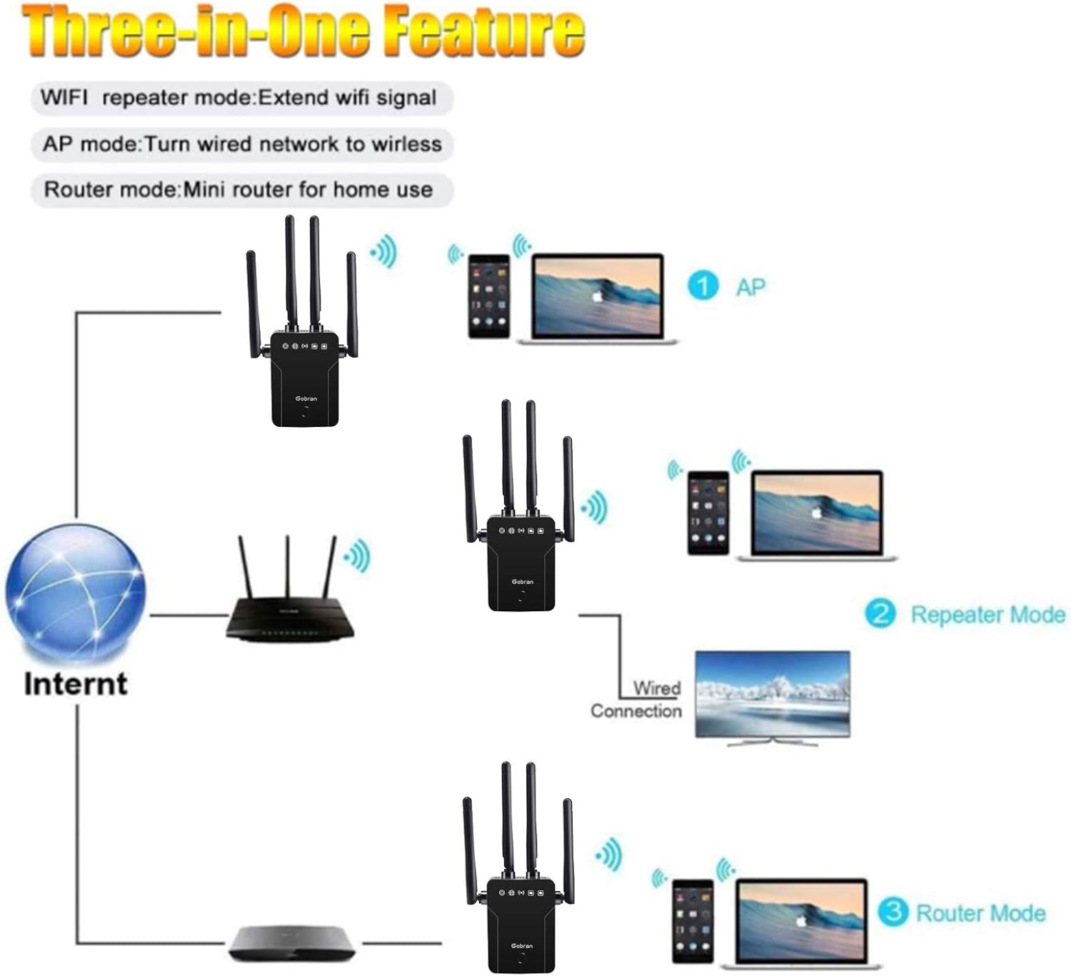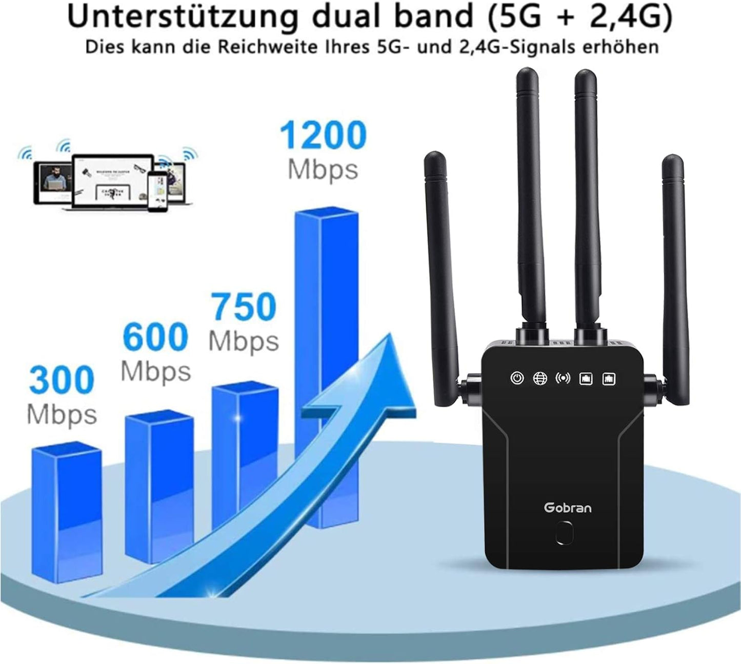 - Like A New Gobran WiFi Extender, 1200Mbps WiFi Amplifier, Dual Band WiFi Extender 5GHz and 2.4GHz, 1 Ethernet Port, Supports AP / Router Mode, Compatible with all Internet Boxes