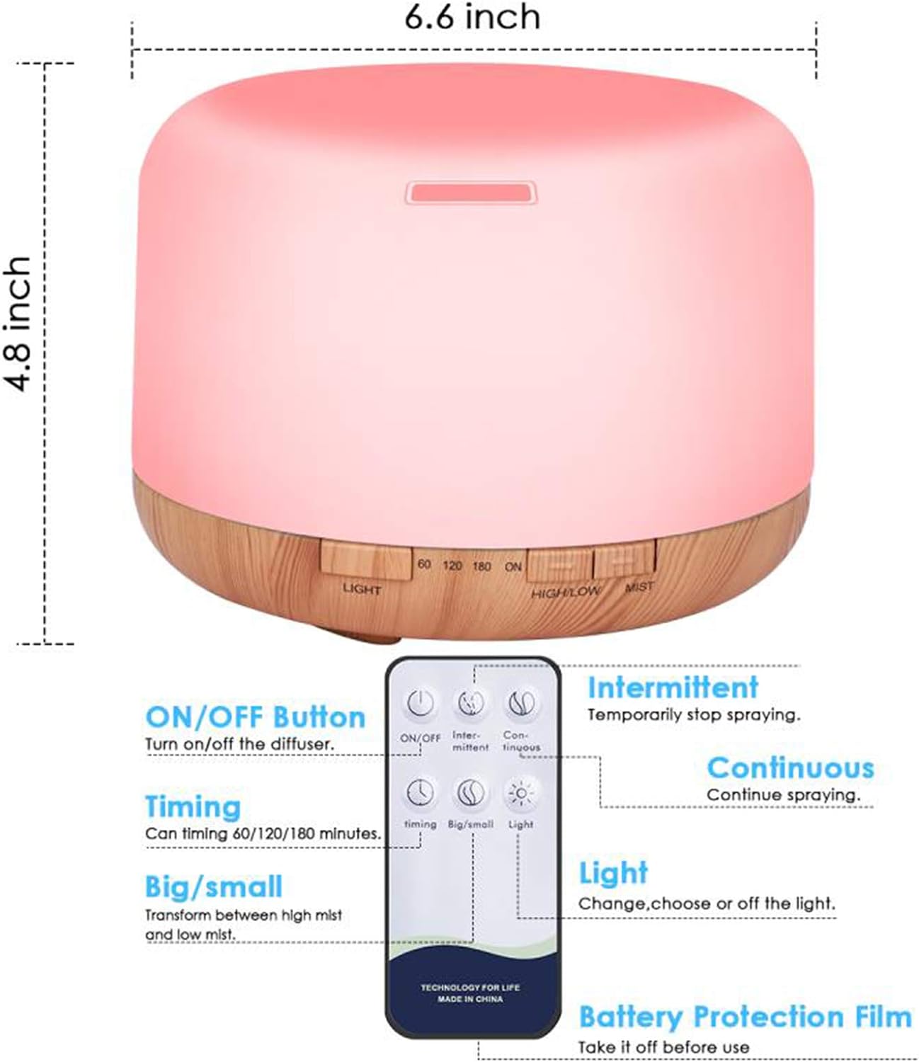 - Diffuserlove Essential Oil Diffuser 500ML Remote Control Ultrasonic Aromatherapy Diffuser Cool Mist Humidifiers with Mute Design, Timer and Waterless Auto Shut-Off, 7 Color LED for Office Living Room