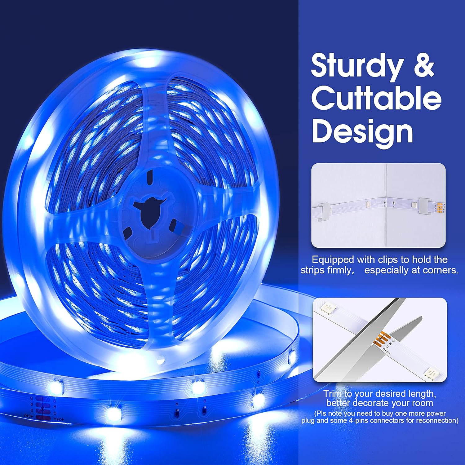 - DIY Cuttable: use a flexible substrate, not easy to break, with cut line marks, you can DIY various length and shape for the rgb strip lights.(Note: connectors are not included, you need to purchase extra 4-pin prongs for re-connection).