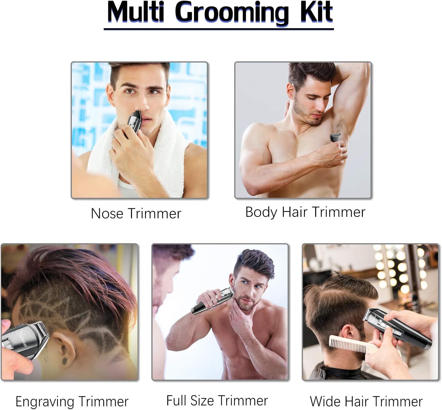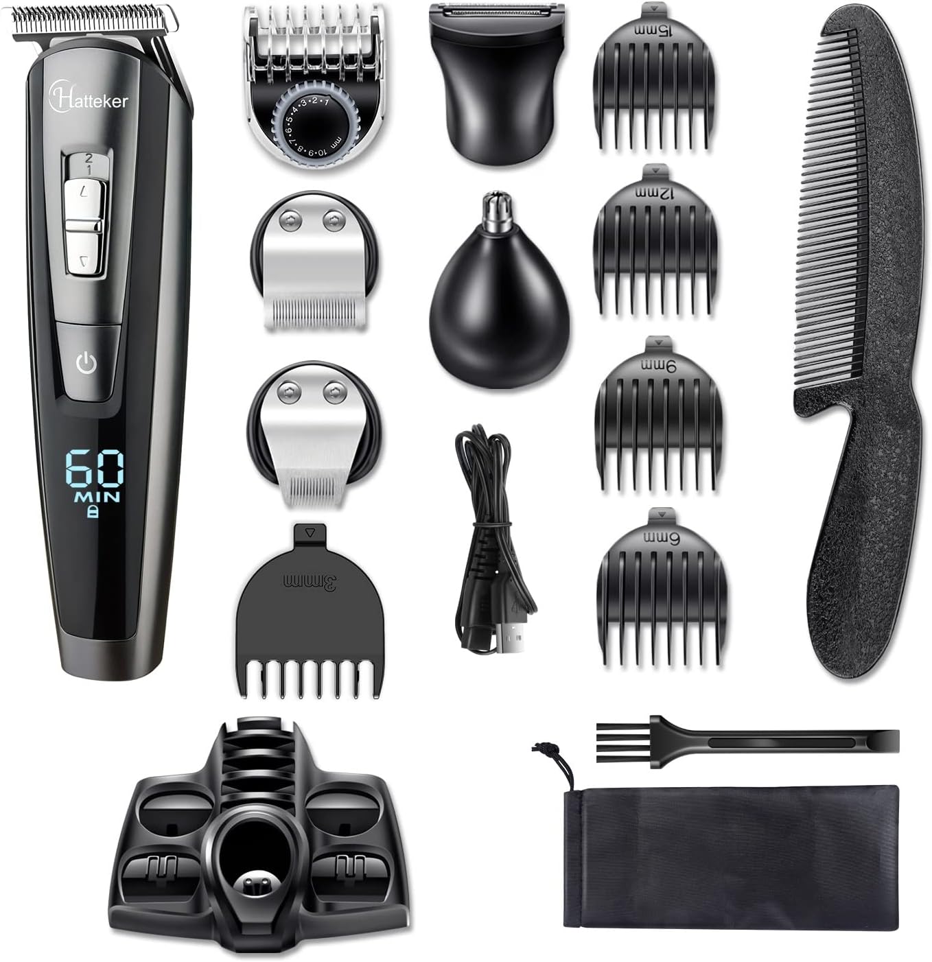 HATTEKER 5 In 1 Beard/ Hair TrimmerMaximum precision, amazingly simple. The Beard Trimmer gives you exact length, precise contours and an even trim.  16 PIECES ALL IN ONE TRIMMERIncludes a beard trimmer,a hair trimmer,a detail trimmer,a body grommer,a nose and ear hair trimmer,6 guide combs,a charger with USB connection,a instruction,an accessory storage bag,and a cleaning brush    HAIR TRIMMERCreates fine lines, contours and details,great hair trimmer for men BEARD TRIMMER/FULL TRIMMERUse the beard trimmer to complete your beard style and get clean without a comb, sharp lines around the edges of your beard. STEEL PRECISION TRIMMERThe narrow design of the full-metal precision trimmer makes it easy to precisely edge and finish small details    BODY GROMMERAllows you to trim and shave conveniently and safely below the neck with an innovative all-in-one design NOSE& EAR TRIMMERThe trimmer quickly trims unwanted nose and ear hair without nicks or cuts. LED DISPLAYEasy for you to read clearly how much using time left and how long need charged    PRECISION DIAL1 adjustable combs (1/2/3/4/5/6/7/8/9/10mm) for a precision trimmer, styling your beard and body hair to any desired look SELECTIVE TRIMMING COMBS1 adjustable beard trimmer comb (3/4/5/6mm) for a full-size trimmer, 4 hair trimmer combs(6/9/12/15mm) for beard trimming or hair cutting 100% WATERPROOFThis hair trimmer is fast and easy to clean. Simply rinse the blades under running water for quick, hygienic cleaning
