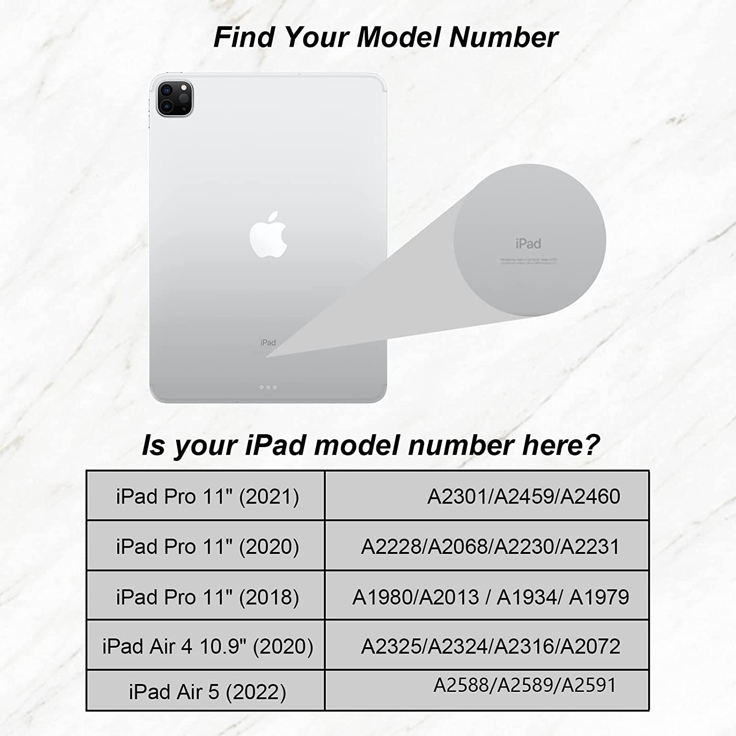 - 【Compatible Devices】This keyboard case is compatible with iPad Pro 11" 4th/3rd Generation 2022 2021 (Model number: A2301/A2459/A2460), for iPad Pro 11" 2nd Generation 2020 (A2228/ A2068/ A2230/ A2231), for iPad Pro 11" 1st Generation 2018 ( A1980/ A2013/ A1934/ A1979), and for iPad Air 5th Generation 10.9 Inch 2022 (A2588 / A2589 / A2591) & iPad Air 4th Generation 10.9" 2020 (A2325/A2324/A2316/A2072).