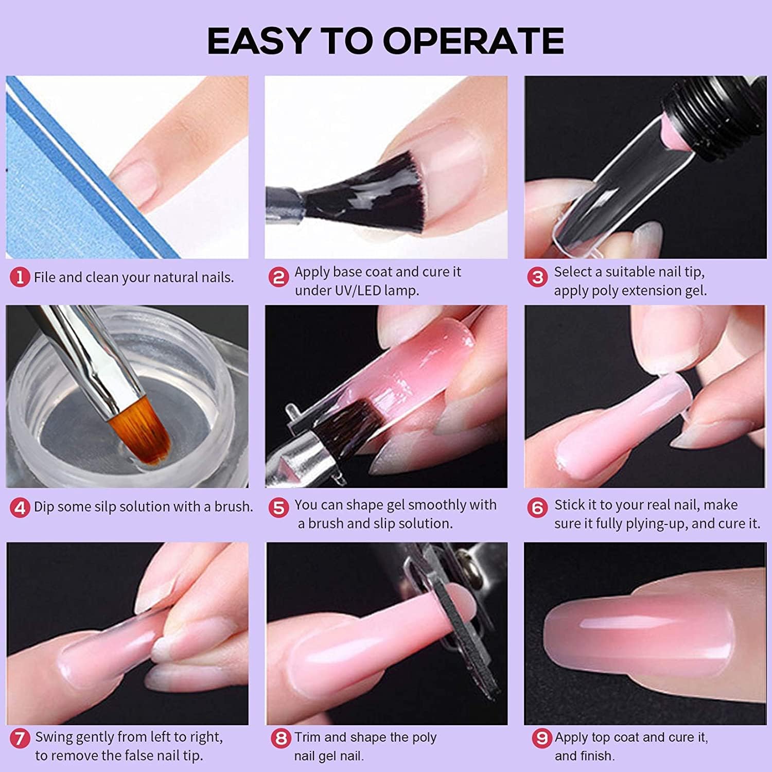 - 【Poly Nail Extension Gel Kit】6 x 15ml color poly nail gel, 36W U V/LED nail lamp, 10ml base & top coat, 60Pcs dual forms (12 Sizes*5Pcs each), 1 x 30ml slip solution, and basic manicure tools, beautiful and diverse nail deco. With this set you can do salon-like gorgeous shiny manicures at home.