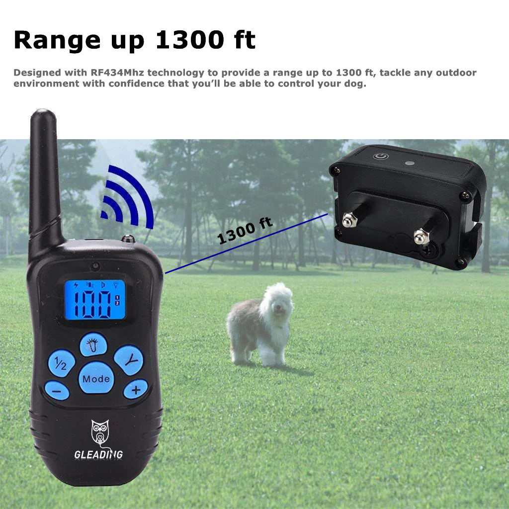 - UP TO 400m/1300ft REMOTE RANGE & LONG BATTERY TIME - Wireless control for up to 400m/1300ft remote range. Feel easy to train your dog with GLEADING Electronic Dog Training Collar in the park or backyard. Long battery life ensure you an effective dog training