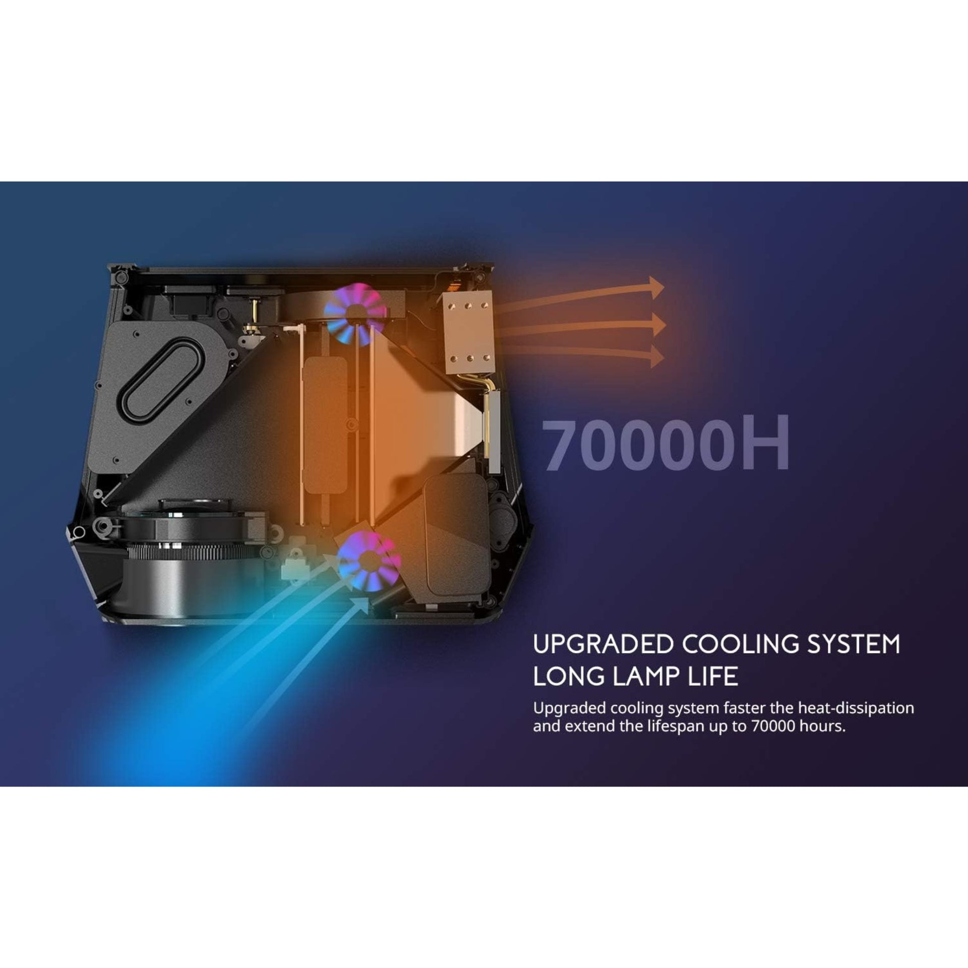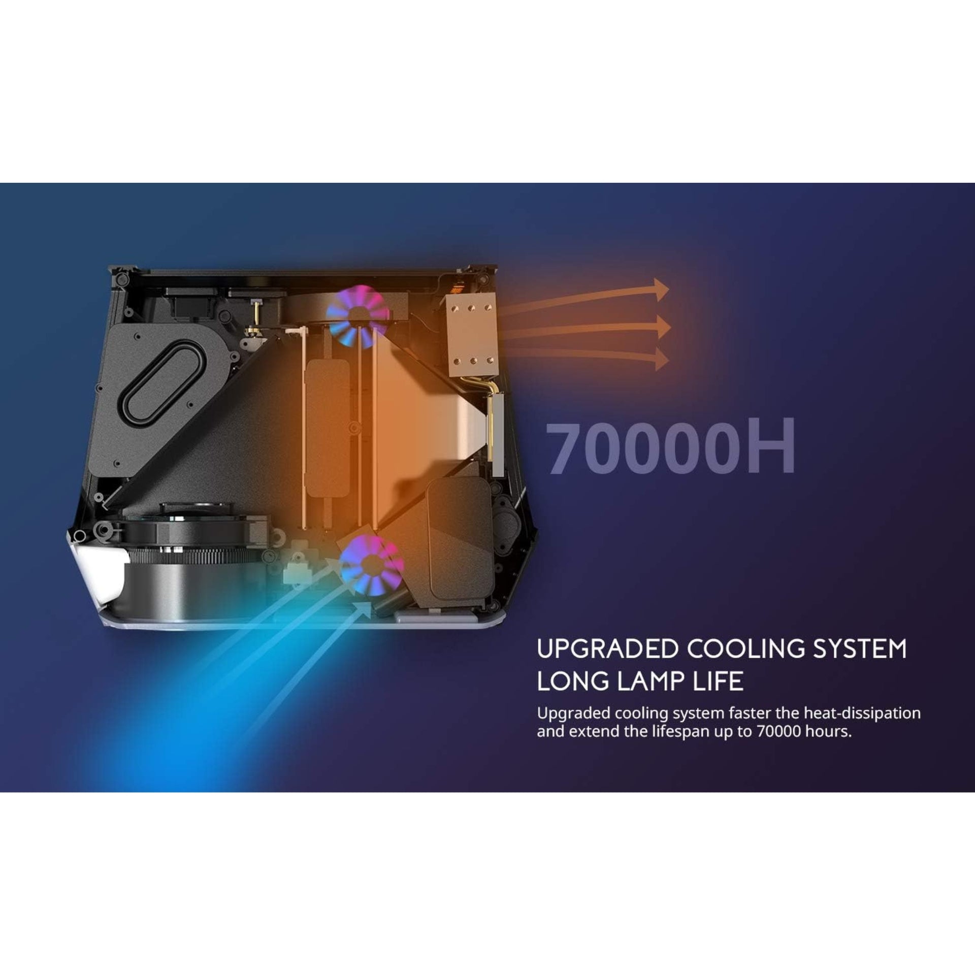 • 🎦 Long Lifespan & Advanced Cooling System ---- Equipped with an innovative cooling system, 2 fans running simultaneous greatly improves the heat dissipation effect, which ensures the projector keep its best performance in a long time operation while working quiet. And minimize the power consumption of Led lamp to extend the useful life of the lamp to a maximum of 70000 hours.