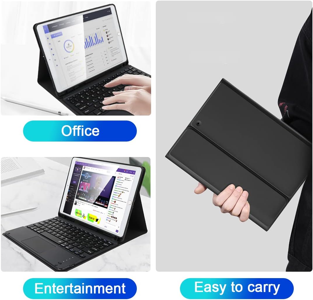 Lively Life Bluetooth Keyboard Case with Touchpad is designed for ipad 10.2 inch and 10.5 inch : iPad 8th generation 2020, iPad 2019 7th generation, iPad Air 3 2019 and iPad Pro 10.5 inch 2017 (NOT compatible with any other devices). This is a great combination of protective case and functional laptop-style detachable keyboard. This wireless keyboard case can turn your ipad into a portable laptop, which is an efficient assistant for studying or office when outgoing or travelling.