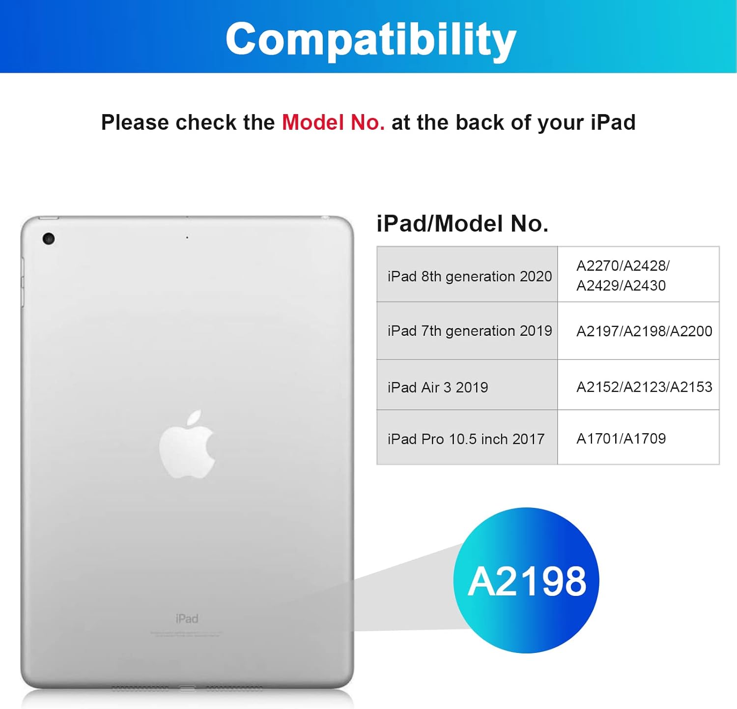 - ⌨️【Keyboard Case Compatibility】The case is designed for the latest iPad 9th 2021 (A2603/A2604/A2605),2020 iPad 8th genneration (A2270/A2428/A2429/A2430) / iPad 7th generation 10.2 inch 2019 (A2197/A2198/A2200), iPad Air 3 2019 (A2152/A2123/A2153), iPad Pro 10.5 inch 2017 (A1701/A1709). Not compatible with any other iPad models. ✘ Reminds: Please check the "Axxxx" logo on the back of the iPad before purchasing.
