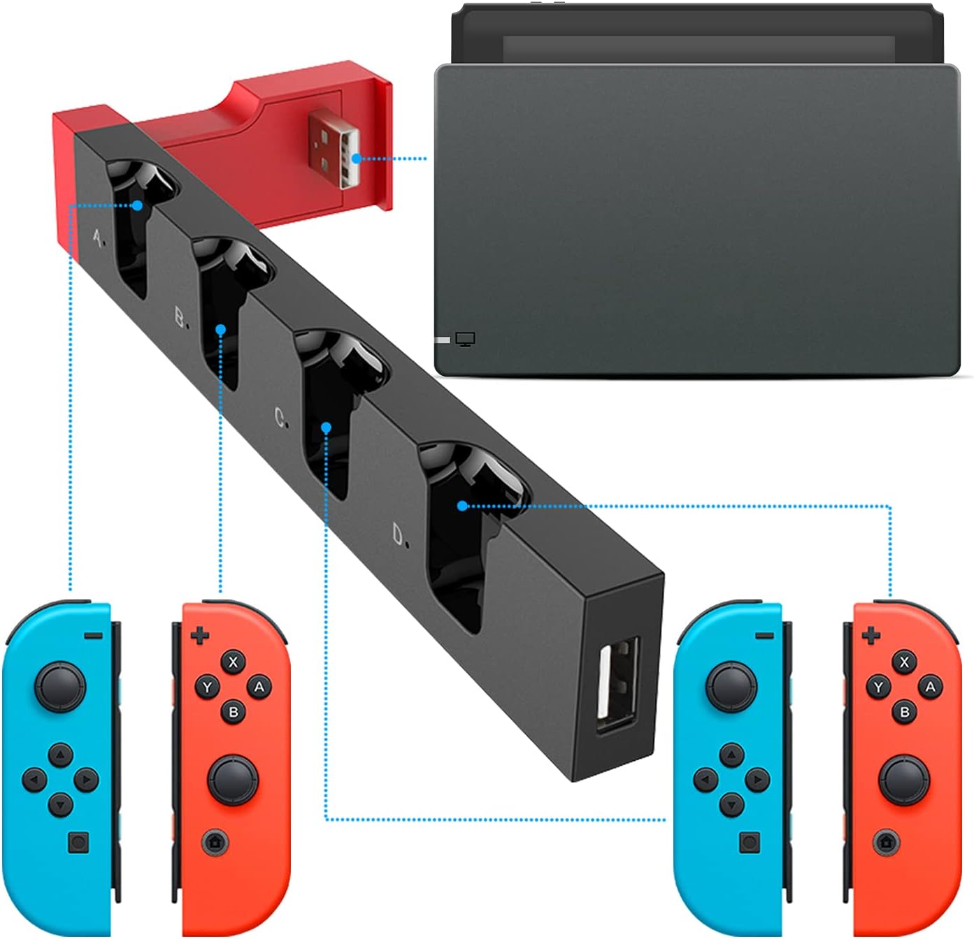 - DESIGN FOR JOY CONS - Specially designed for Nintendo Switch and controller for Joy Cons/ Switch OLED. Charger station holder for Nintendo Switch Joy Cons. The charger has 4 ABCD loading slots, which supports loading 1 to 4 controllers for JoyCon at the same time.