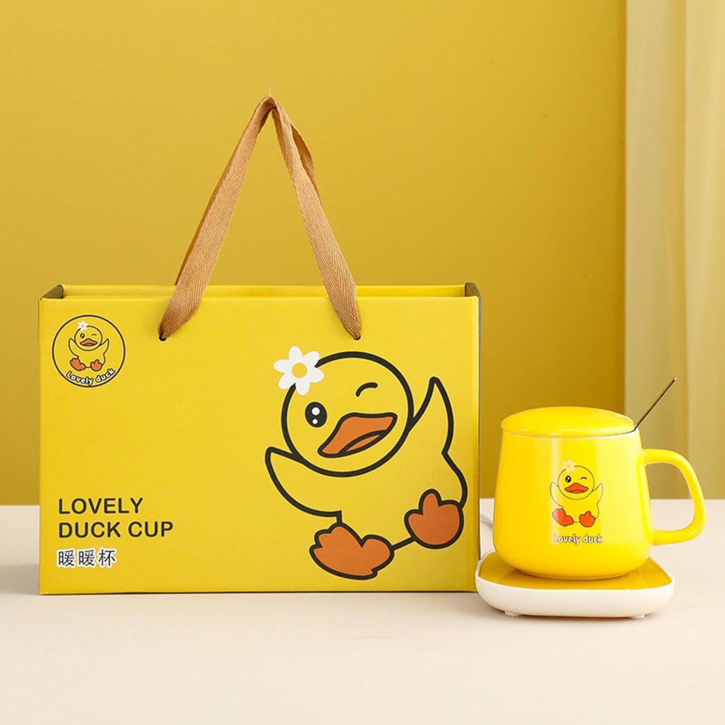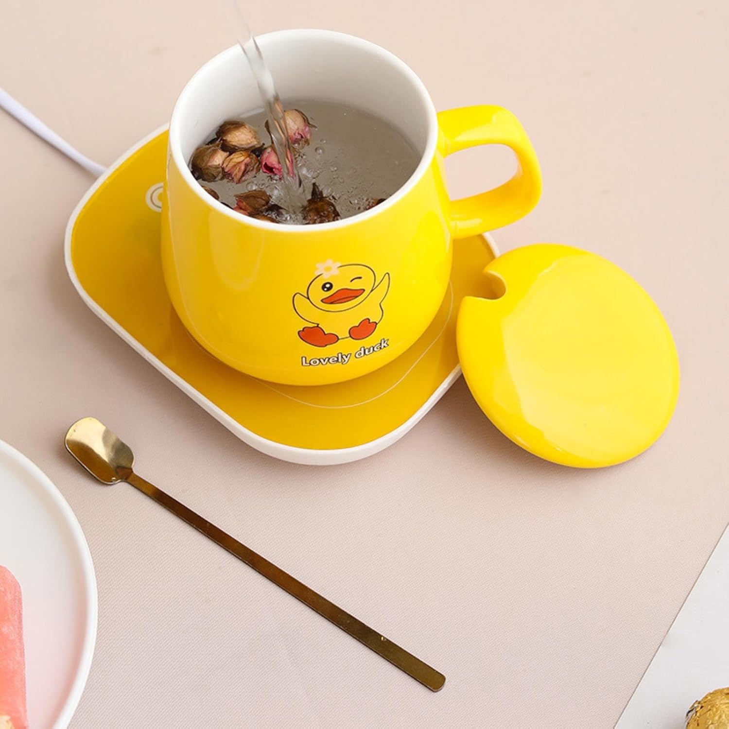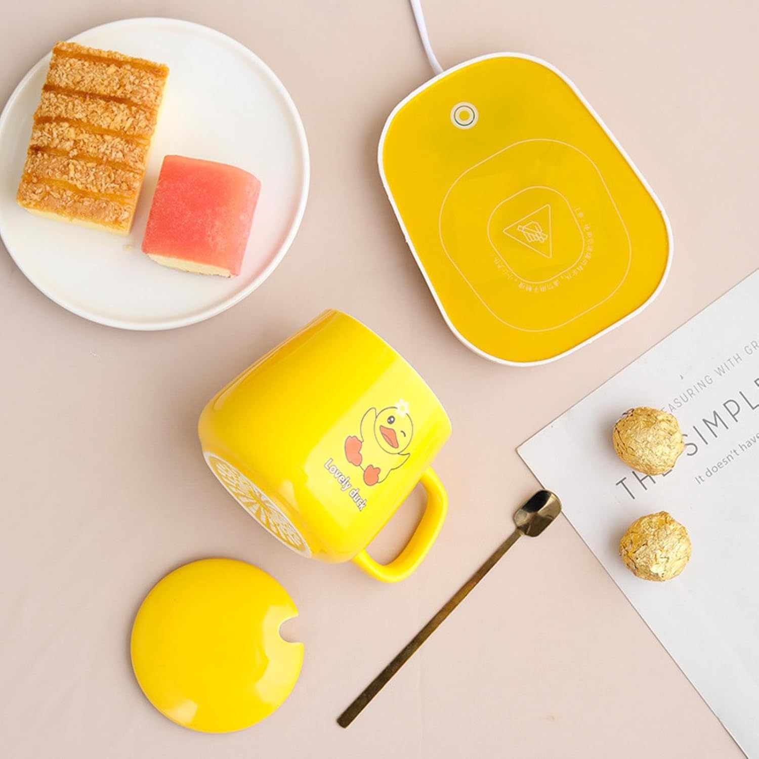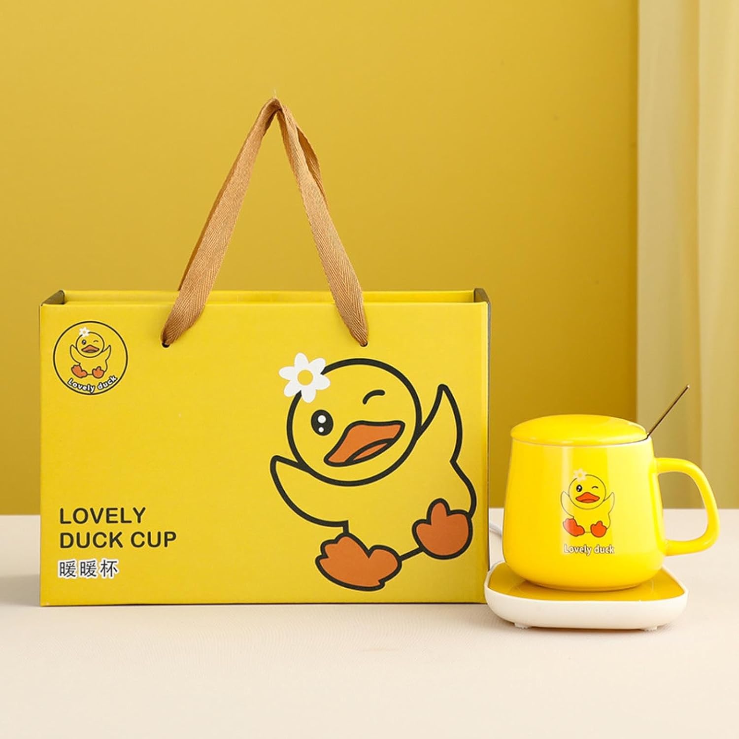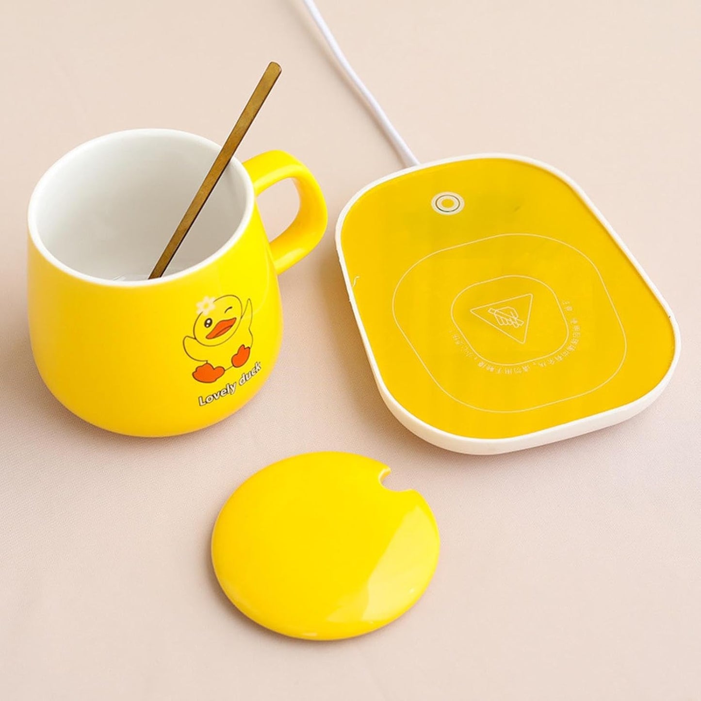 - 250ml Cartoon Yellow Duck Constant Temperature 55 Degree Ceramic Mug With Lid And Spoon, Heated Coaster Gift Box-Little Yellow Duck - Gift Box Package