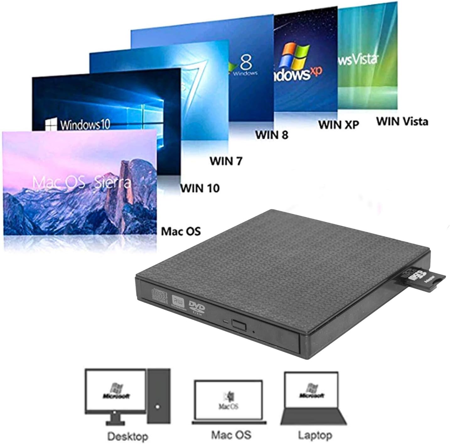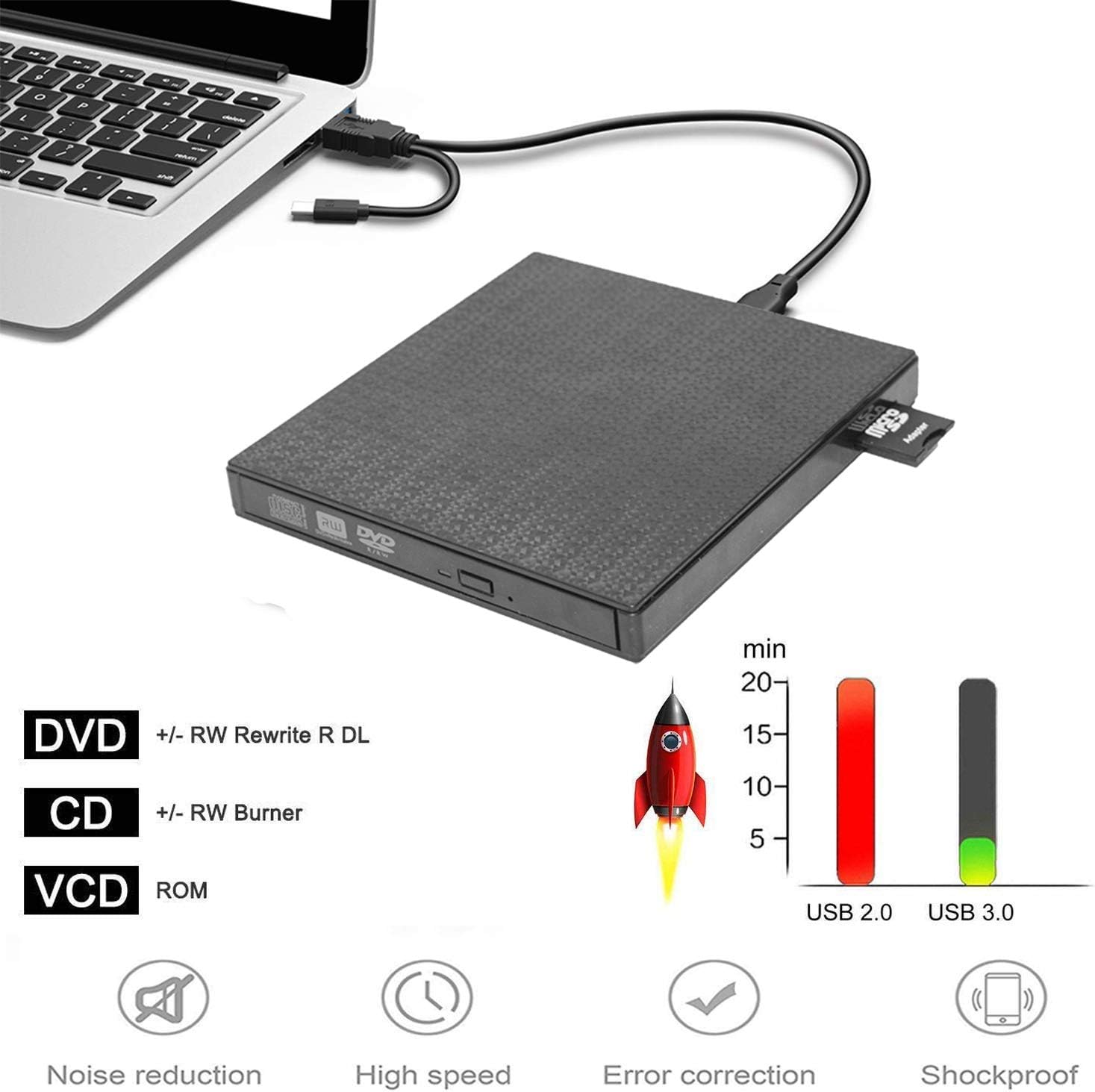 External DVD CD Drive High-Speed USB-C&USB 3.0 CD DVD-RW Player Burner Writer Rewrite Support SD/TF Card/2 USB 3.0 Ports/Charging,Compatible with WriteOS/Windows/MacBook/Laptop/Desktop Computer pc