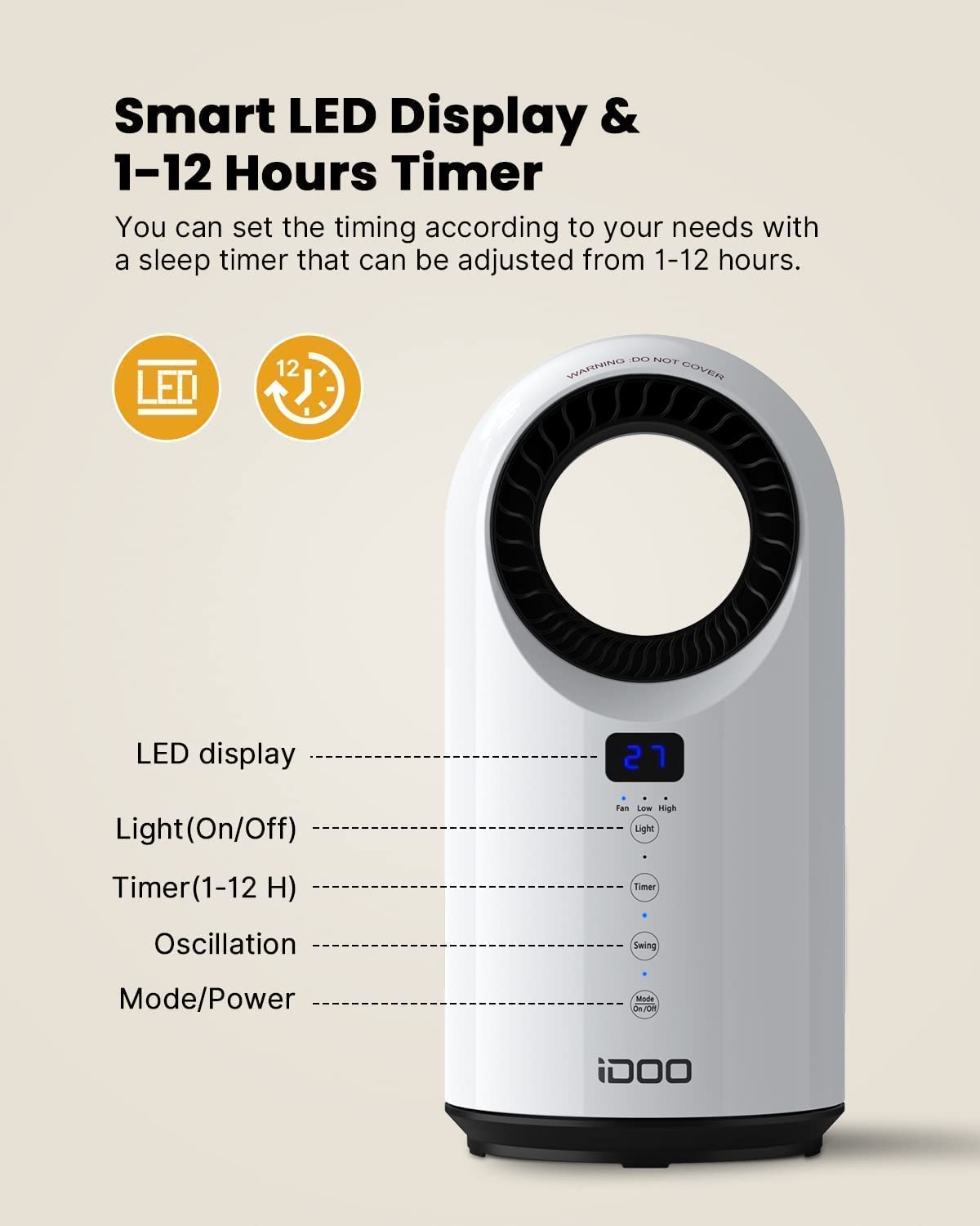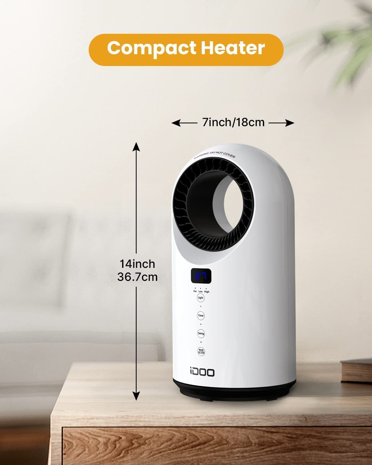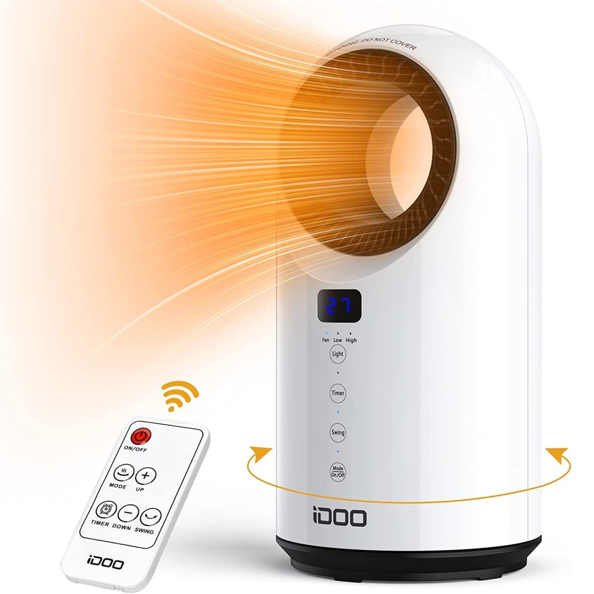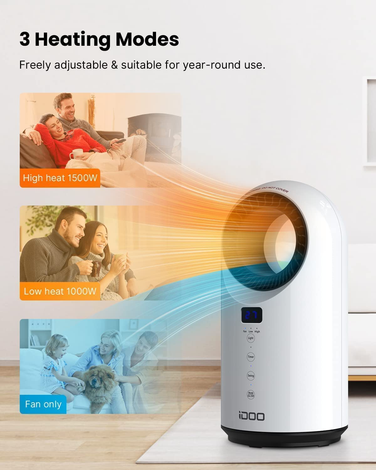 3 Heating ModesiDOO ceramic heater comes with 3 heating modes to easily customize your airflow. High heat (1500W): fast heats-up in 2 seconds. Low heat (1000W): makes you feel cozy warmth. Fan-only(25W): deliver smooth natural airflow. |