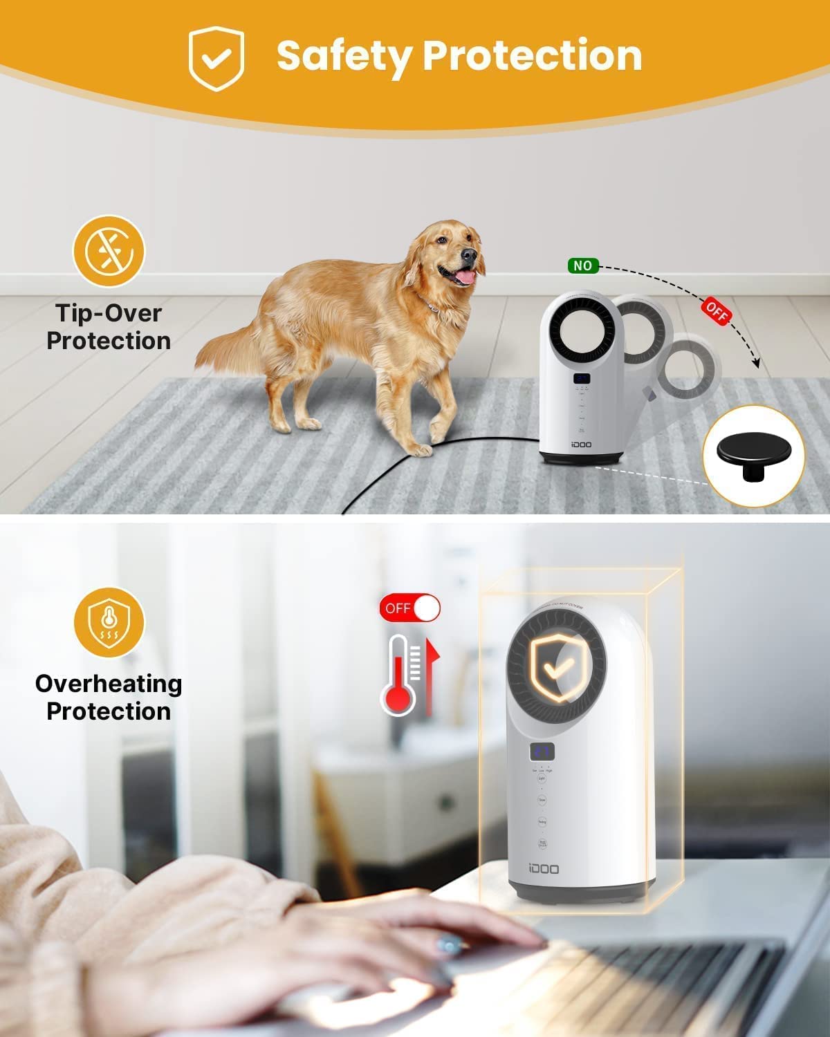Safety ProtectionEquipped with safety features, including tip-over protection, overheating protection, self-regulating ceramic element, ETL Listed, and cool-touch housing that doesn't get hot and is safe for children. |