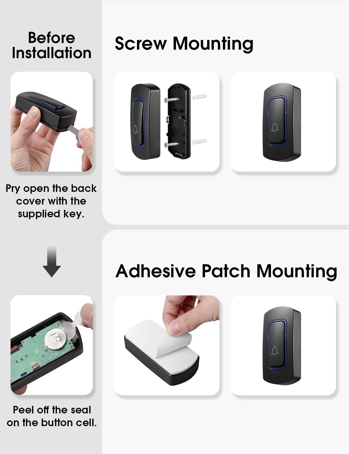 【Easy to Set Up】 Simply plug the receiver into a power outlet and attach the transmitter to the exterior wall with the provided screws or adhesive patch. This wireless doorbell set is by far the most convenient choice for your home and business