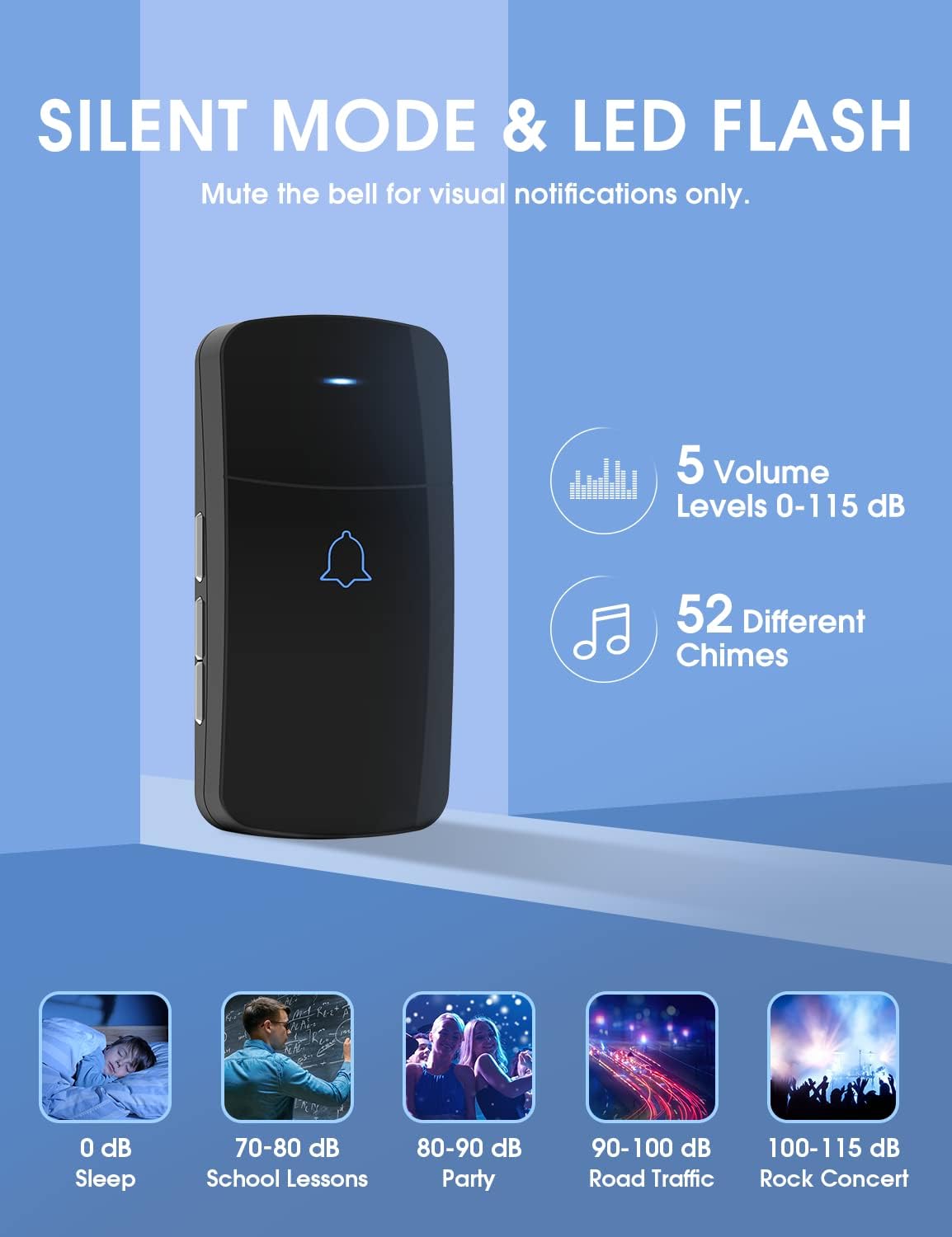 - 【Pleasant Chimes】The receiver bell features 52 tunes and 5 adjustable volume levels ranging from 0 to 115 dB; an LED indicator alerts those with impaired hearing or when the doorbell sound is (temporarily) unwanted