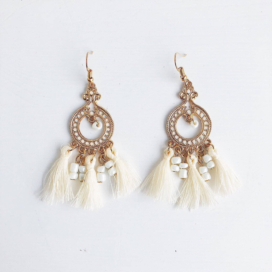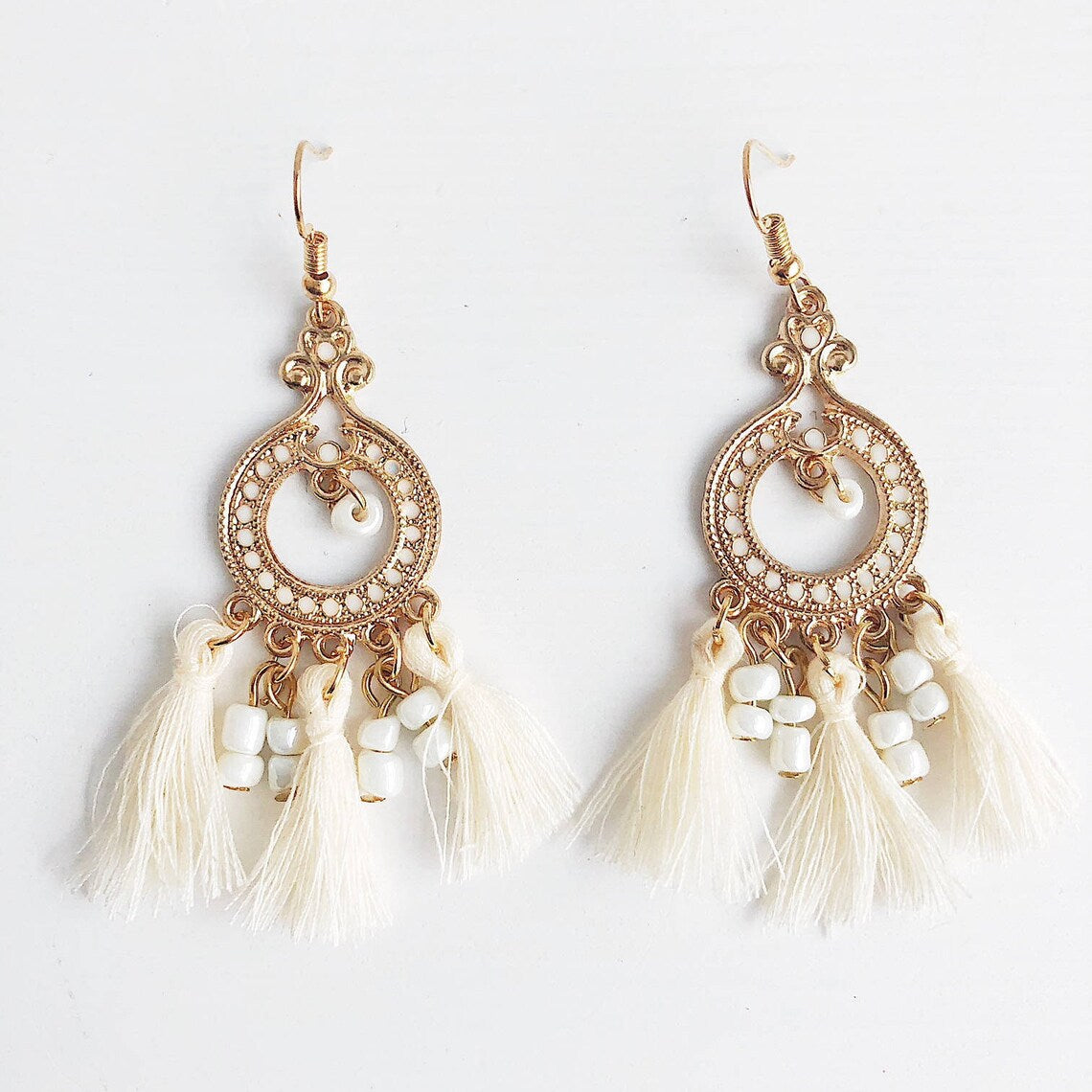 - Ankara Tassel Earrings - White. Gold Statement Earrings. Boho Earrings.
