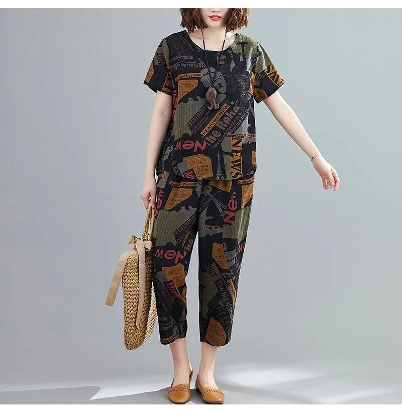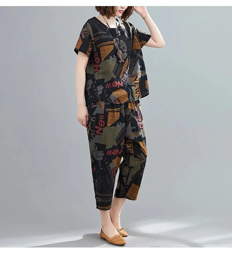 - two piece set women Cotton Linen Summer Loose tshirt Lady Tops Shirt and Harem Pants Fashion Letter Print ropa mujer