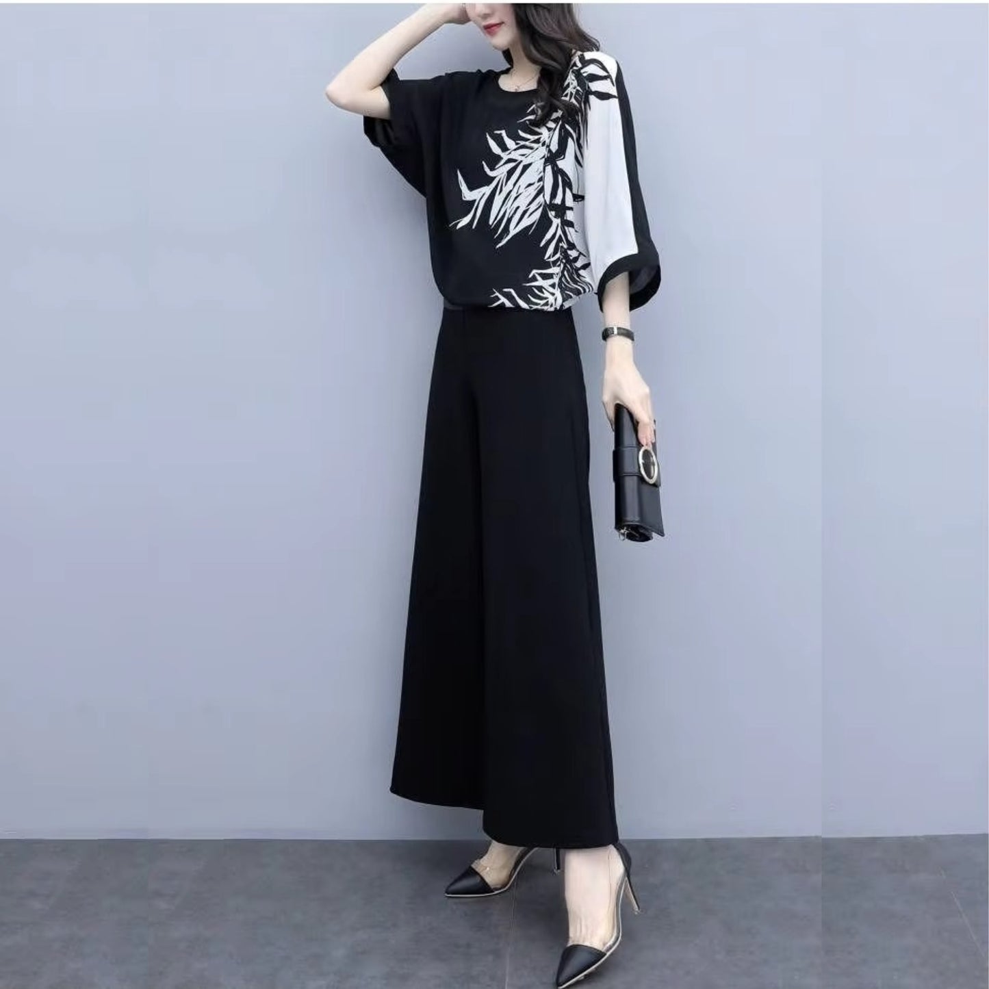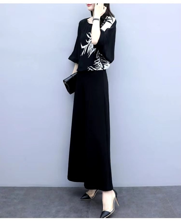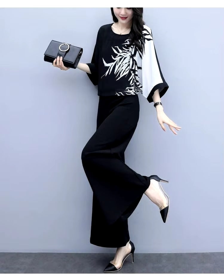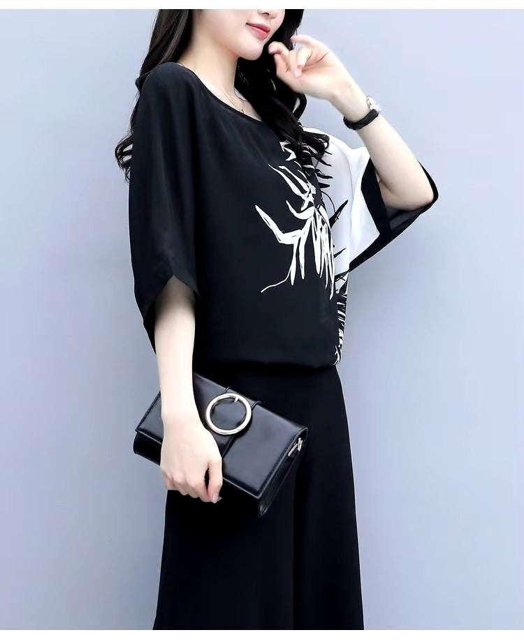 - Women's Suit 2024 Summer New Chiffon Wide Leg Pants Outfits Socialite Hem Shirt Crop Top Two Piece Set Plus Size Clothing Women