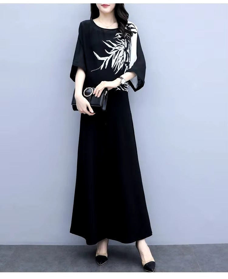 Women's Round Neck Temperament Dress Short-Sleeve Fashion Print Loose Waist Mid-Length Dress