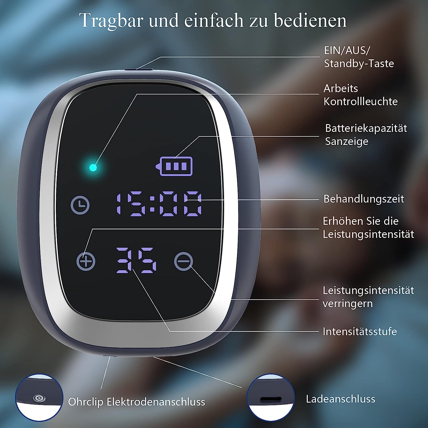 - 【Operating instruction】Clip the ear clips to the Chui Qian acupuncture point on each side of your earlobes and long press the power button to turn it on, then click the intensity button to set the intensity you want. PLEASE CLEAN AND WET YOUR EARLOBE WITH WATER, ALCOHOL OR SOAPY WATER TO INCREASE CONDUCTIVITY IF YOU HAVE NO FEELINGS.