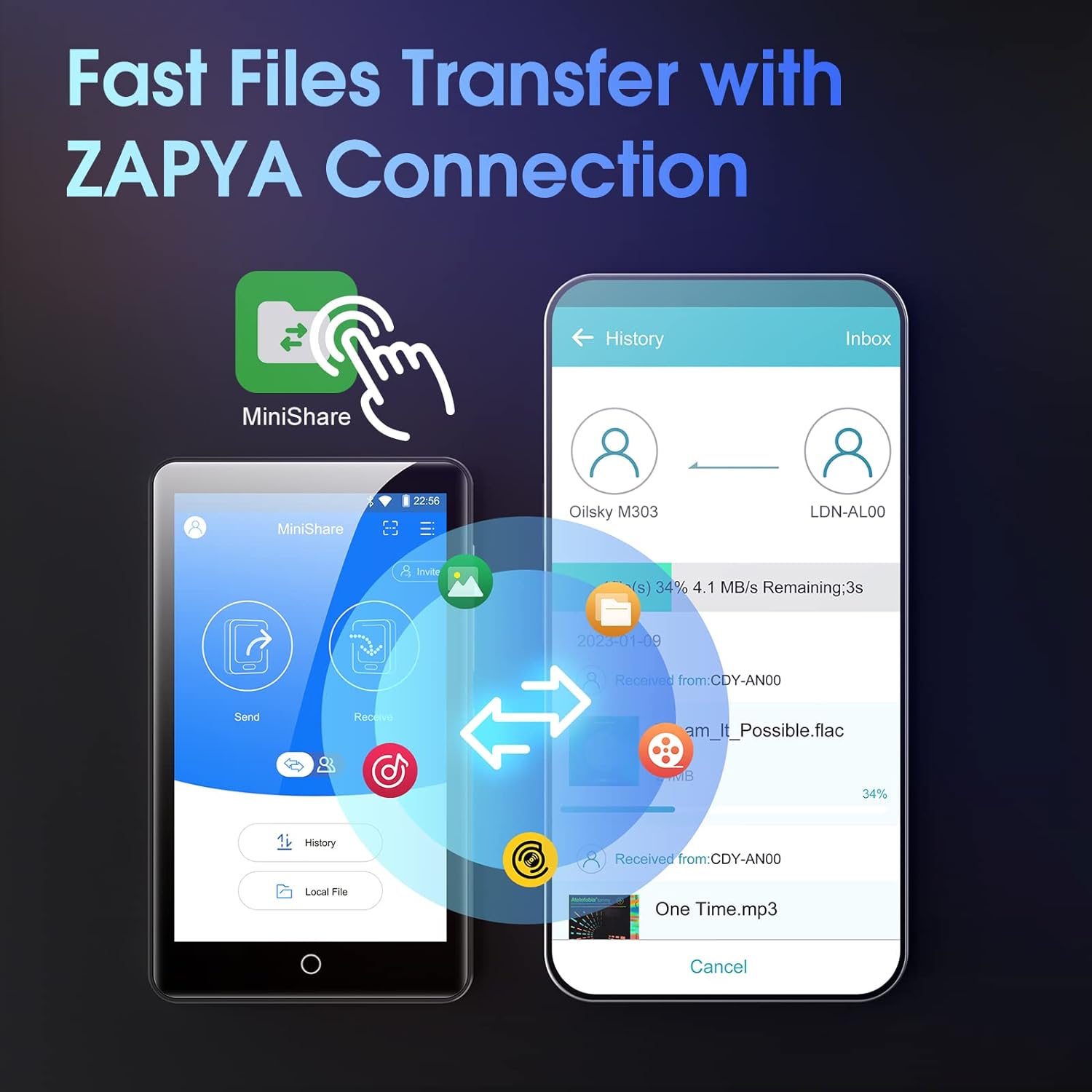 - 🎁【Mini Share File Transfer】The mp3 player doesn't only allow you to upload music and videos through a USB cable, it also has the capability to share and transfer files via Bluetooth or WiFi. In fact, the player has a built-in file transfer app "Minishare" that simplifies the process of transferring files between the player and your smartphone, especially for Android devices. To learn more about the use step, please refer to the User Guide PDF File available in the download link of the page.