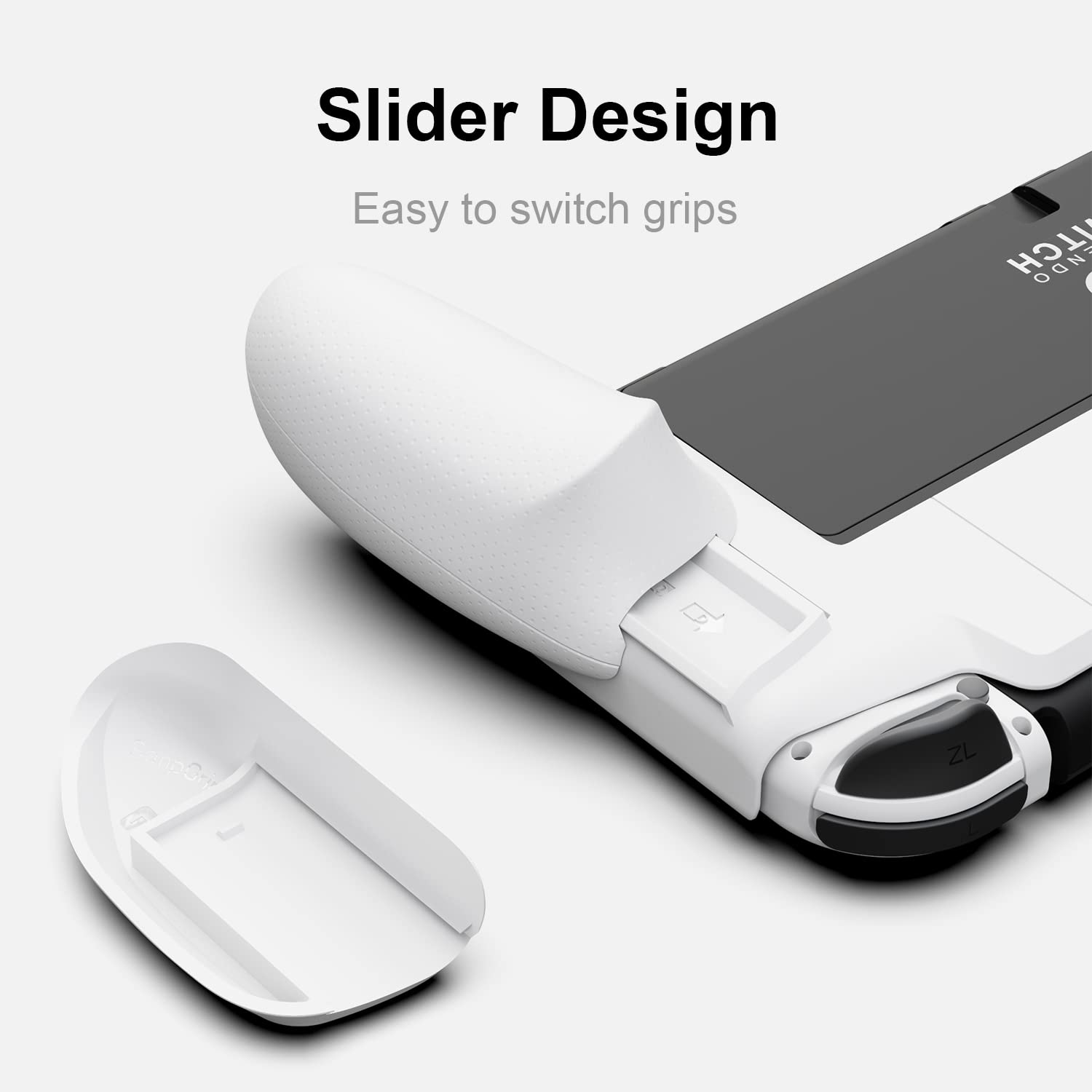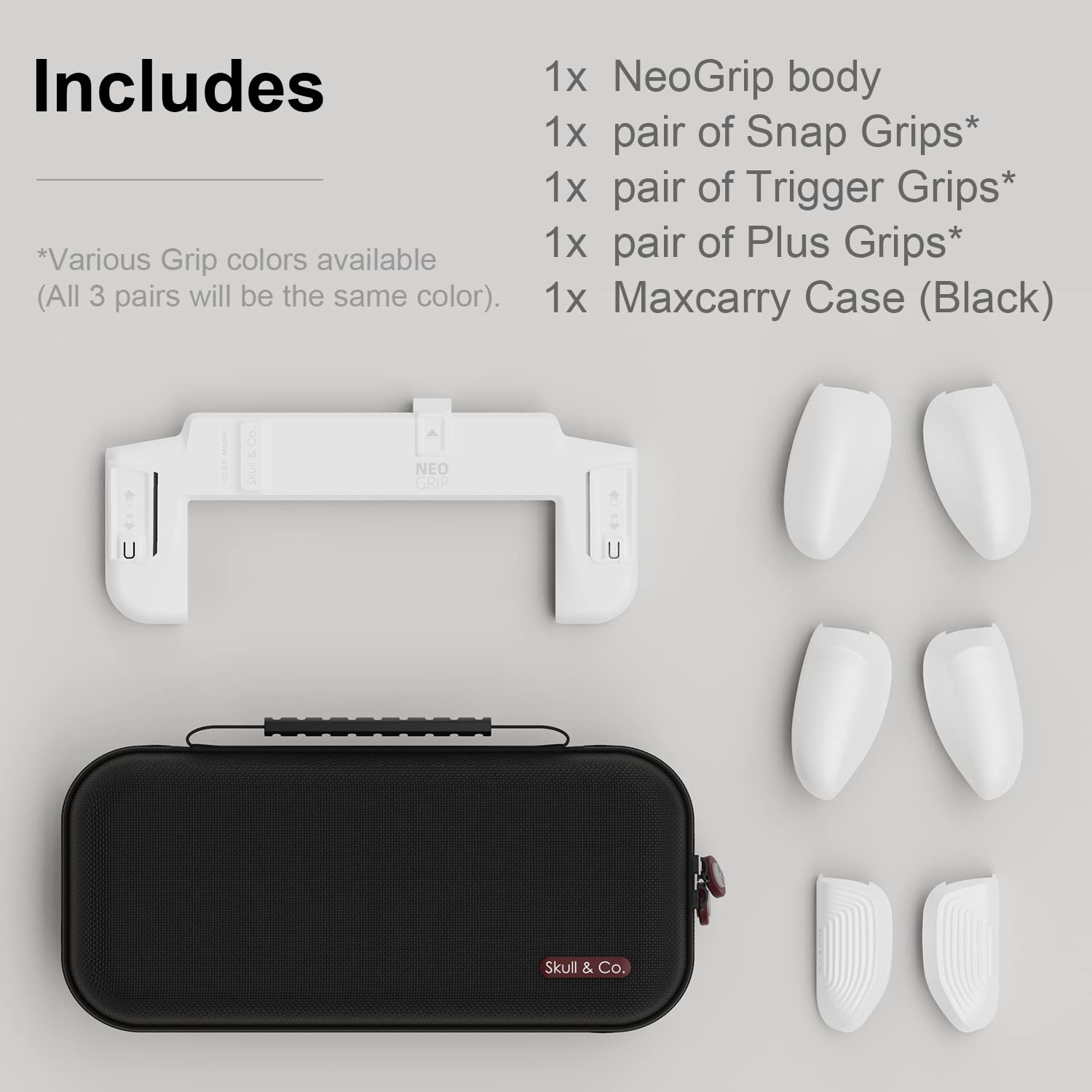 Skull & Co. NeoGrip Bundle: An Ergonomic Grip Hard Shell with Replaceable Grips [to fit All Hands Sizes] for Nintendo Switch OLED and Regular Model [with Carrying Case] - White