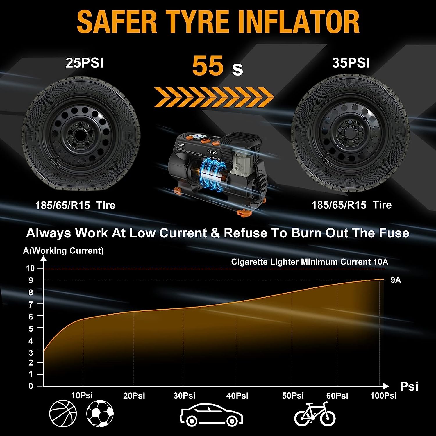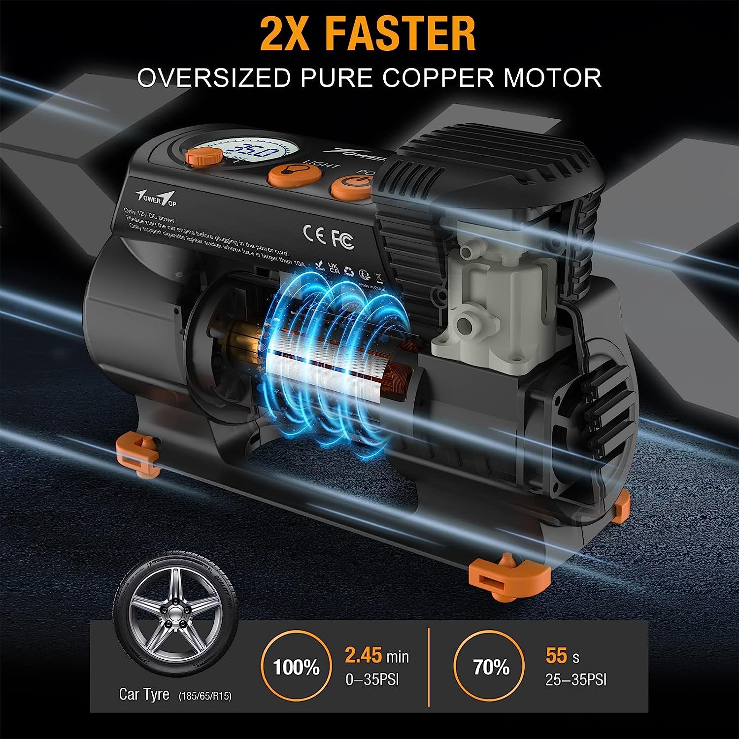 - 2X Faster Inflation & Safety: We adopts a new high-speed pure copper design turbocharger core to make us inflate 2x faster. Only 2.45 minutes to pump up one 185/65 R15 car tyre(0-35PSI). Even under 100 PSI pressure, our working current will not exceed 9A and will not blow the fuse. Get the speed and safety you need for your next journey with TowerTop!