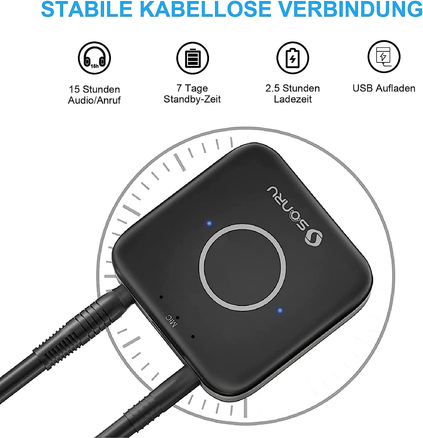 Long distance This Bluetooth receiver jack can receive music from up to 10 metres away, so you can control your music more comfortably. |