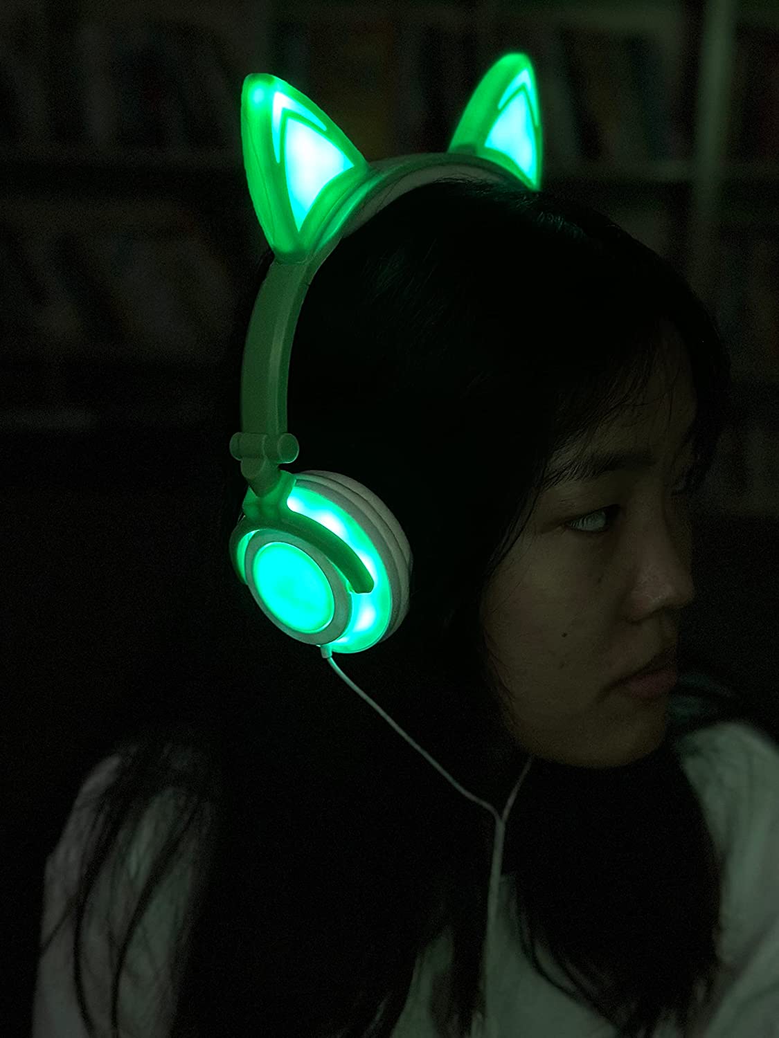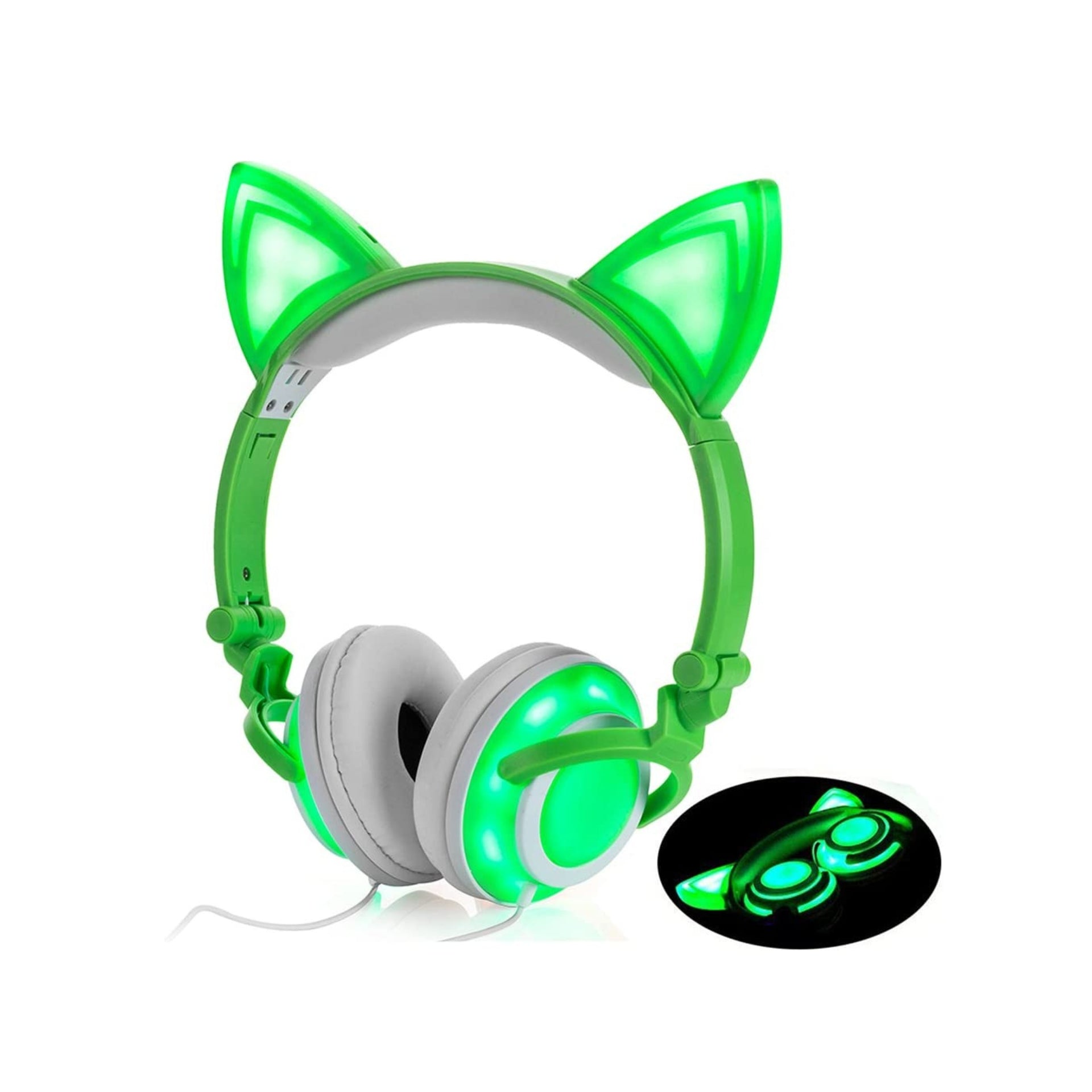 Olyre Kids Headphones with LED Light Up, Cute Cat Ear Earphones for Girls Teens Adults, Stereo Adults Headphone with 3.5mm Jack for iPad Tablet Computer Mobile Phone (Green)