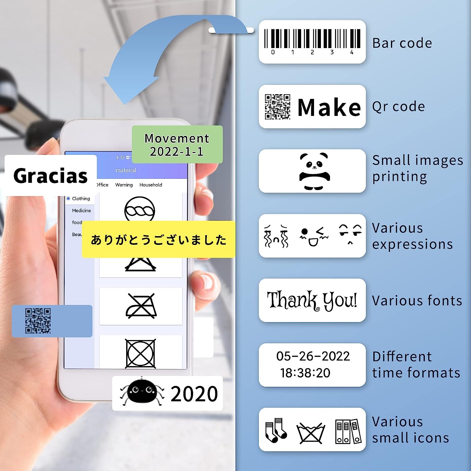- 【Customize Your Own Label】Easy to set up and use! Editing in the mobile APP. SKIO bluetooth label maker machine supports various fonts, numbers, cute icons, images, date, barcode, QR Code, line, geometry frame, scaning code and even voice to text function. Easy to change font style, size and position. SKIO wireless labeler maker supports transparent, glitter label paper.