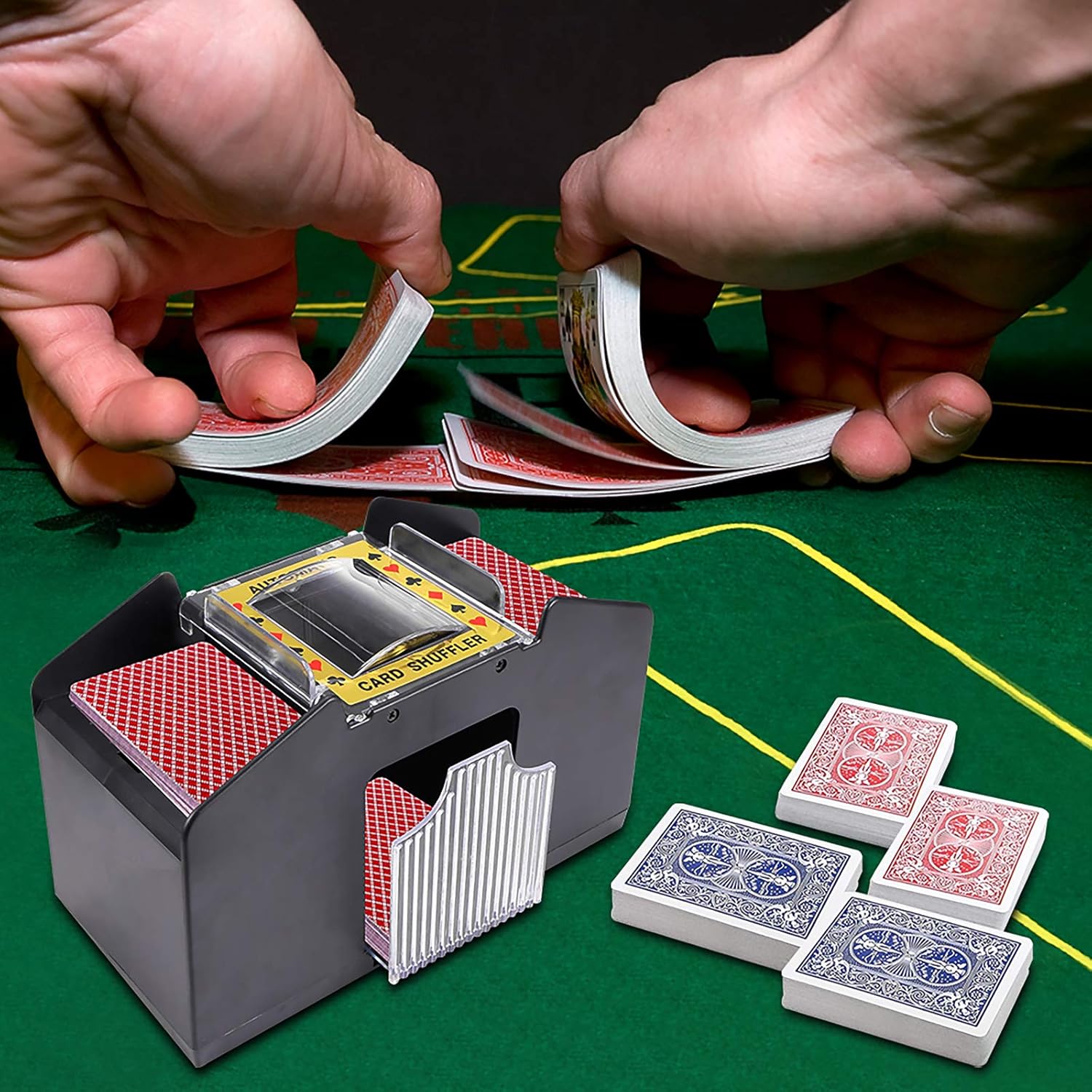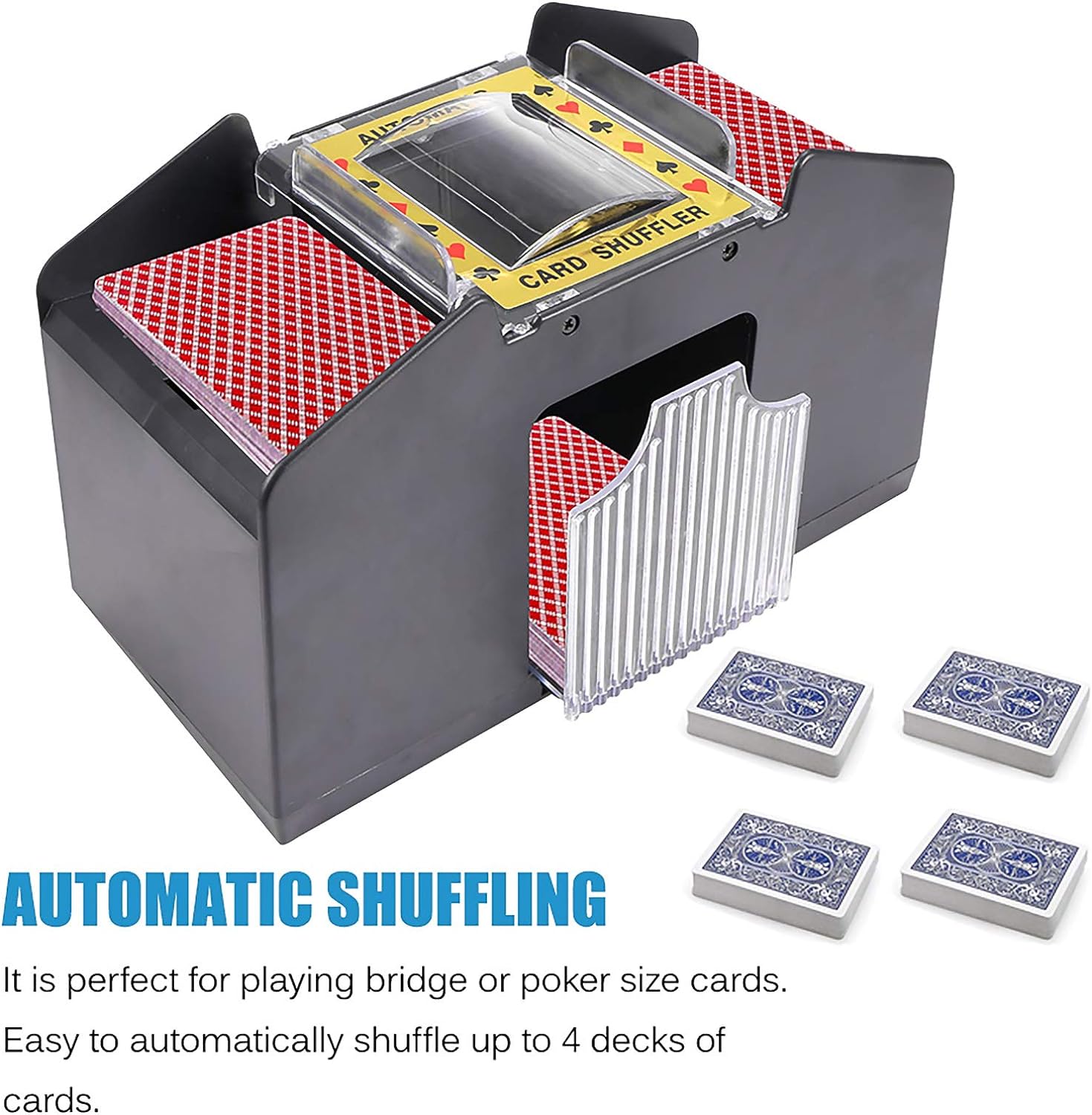 - Automatic mixing that helps you free your hands: the automatic mixing machine adopts the latest creative design that can automatically mix up to 4 decks of cards at the same time. The electric shuffler is solid and guarantees maximum fairness every time, avoiding annoying disputes over cheating or insufficient mixing. Make sure your card is as flat as possible before use.