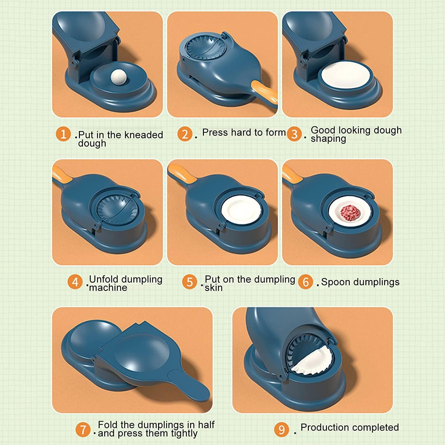 - 【2 in 1 Dumpling Maker Machine】Put the dough on the 2 in 1 dumpling pressing mold, pull down the handle and press the dumpling skin. Put the dough on the surface, add your favorite fillings in the dough, then close the mold and press to seal a perfect packet.