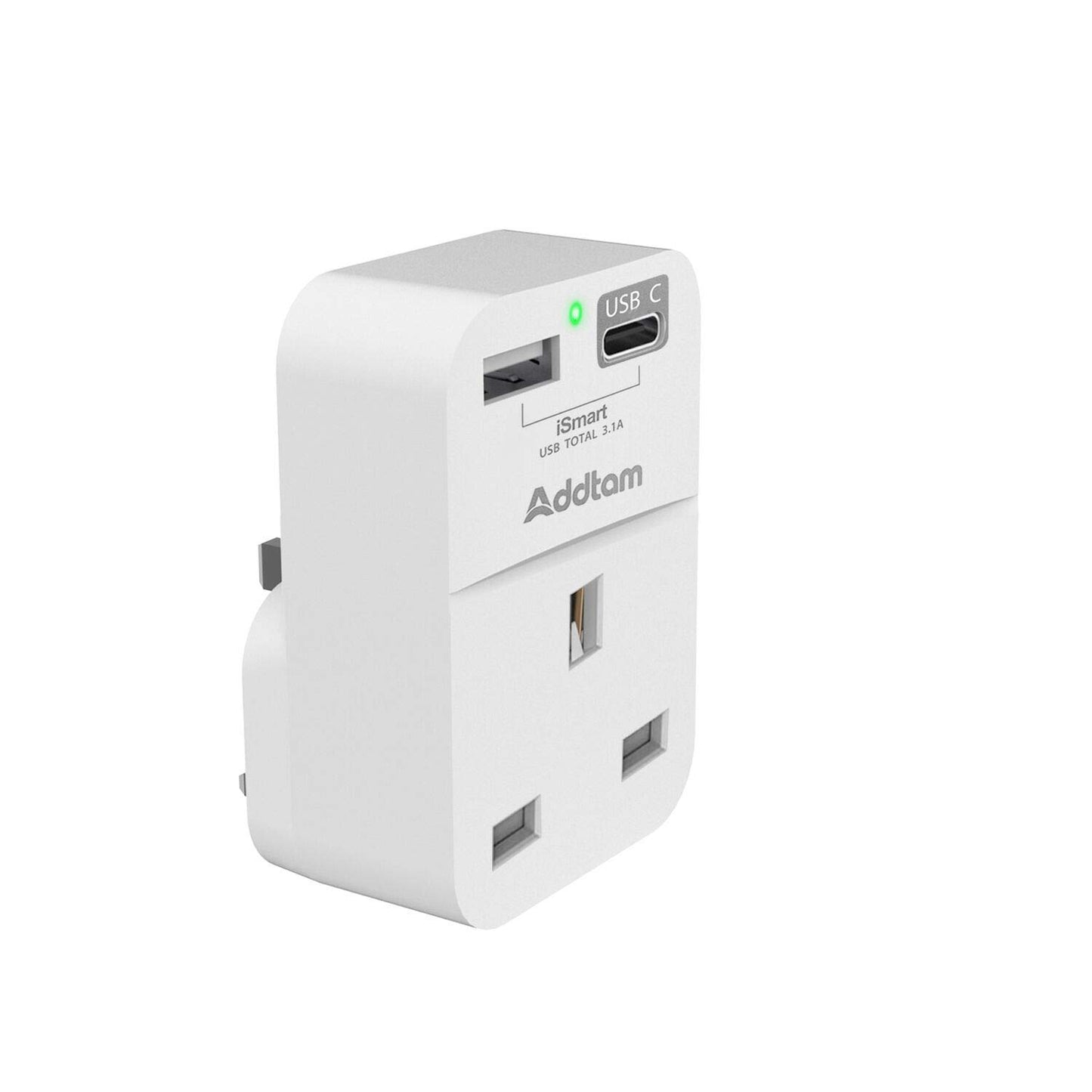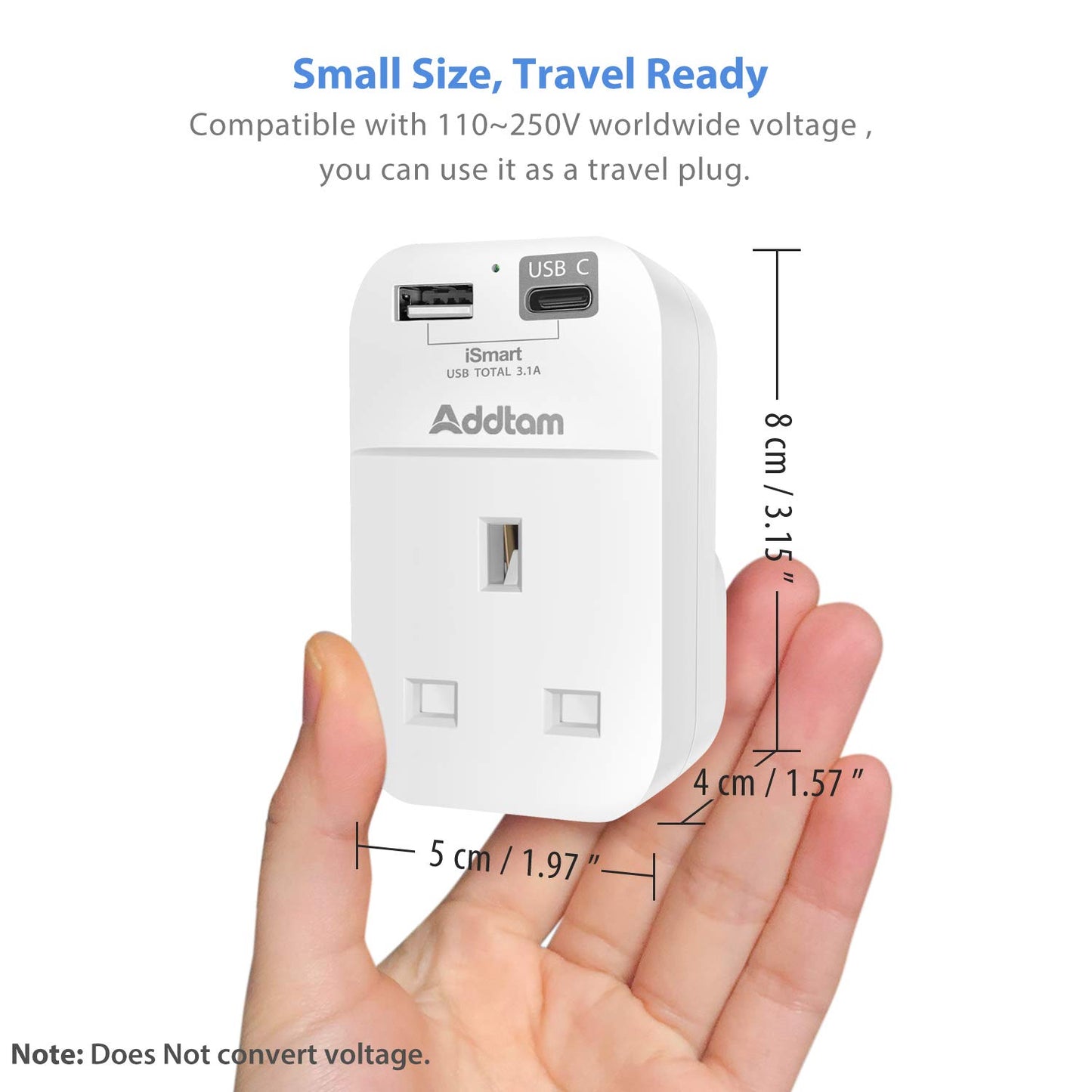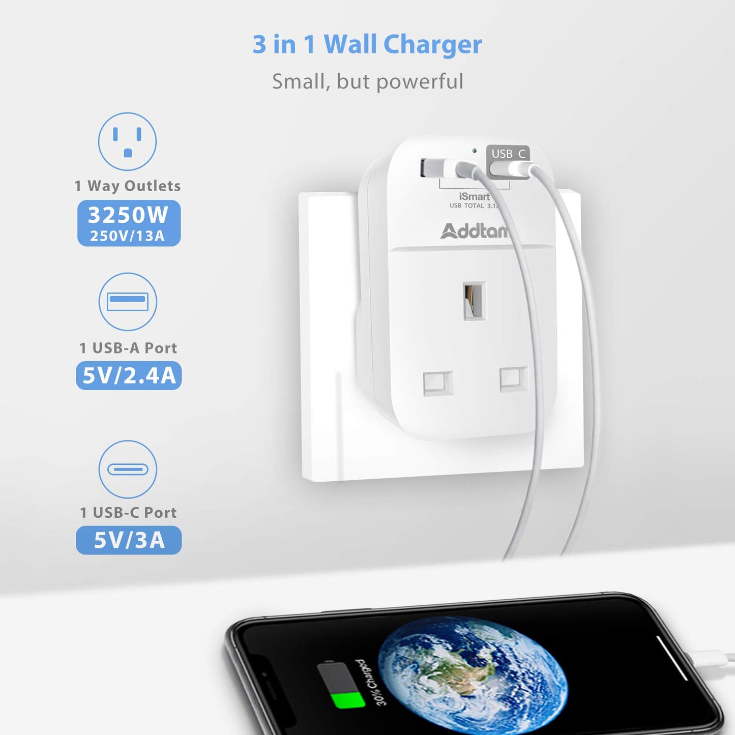 Addtam USB Plug Adaptor UK, Plug Extender with Cable-Free 1 Way 13A Wall Socket Adapter, Wall Plug Extension with 2 USB Slots(1 USB-C Fast Charging and 1 USB-A), Mini & Portable for Home/Office/Travel